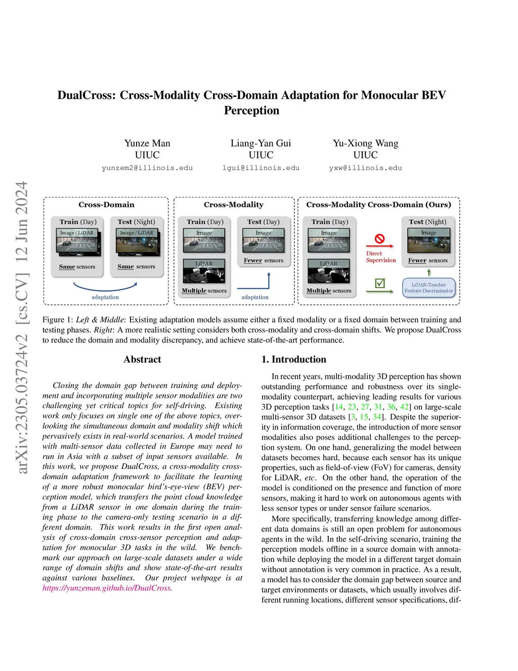 Closing the domain gap between training and deployment and incorporating multiple sensor modalities are two challenging yet critical topics for self-driving. Existing work only focuses on single one of the above topics, overlooking the simultaneous domain and modality shift which pervasively exists in real-world scenarios. A model trained with multi-sensor data collected in Europe may need to run in Asia with a subset of input sensors available. In this work, we propose DualCross, a cross-modality cross-domain adaptation framework to facilitate the learning of a more robust monocular bird's-eye-view (BEV) perception model, which transfers the point cloud knowledge from a LiDAR sensor in one domain during the training phase to the camera-only testing scenario in a different domain. This work results in the first open analysis of cross-domain cross-sensor perception and adaptation for monocular 3D tasks in the wild. We benchmark our approach on large-scale datasets under a wide range of domain shifts and show state-of-the-art results against various baselines.