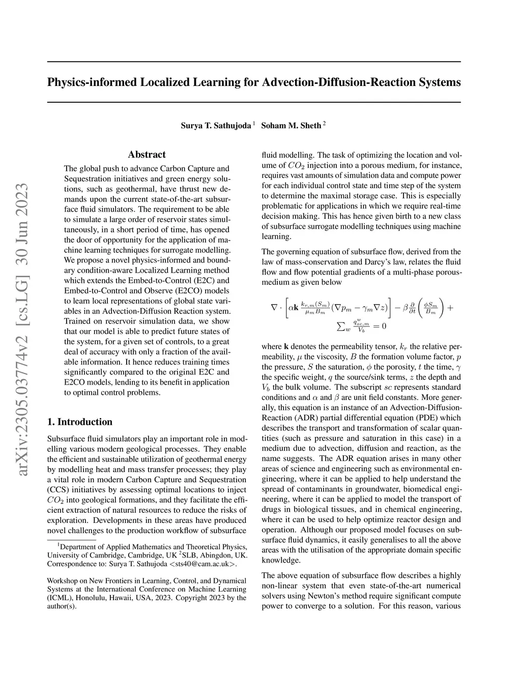 The global push to advance Carbon Capture and Sequestration initiatives and green energy solutions, such as geothermal, have thrust new demands upon the current state-of-the-art subsurface fluid simulators. The requirement to be able to simulate a large order of reservoir states simultaneously, in a short period of time, has opened the door of opportunity for the application of machine learning techniques for surrogate modelling. We propose a novel physics-informed and boundary condition-aware Localized Learning method which extends the Embed-to-Control (E2C) and Embed-to-Control and Observe (E2CO) models to learn local representations of global state variables in an Advection-Diffusion Reaction system. Trained on reservoir simulation data, we show that our model is able to predict future states of the system, for a given set of controls, to a great deal of accuracy with only a fraction of the available information. It hence reduces training times significantly compared to the original E2C and E2CO models, lending to its benefit in application to optimal control problems.