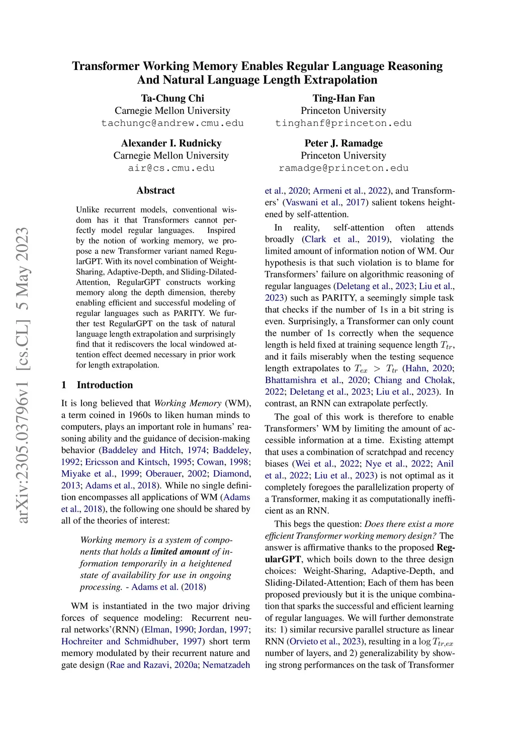 Unlike recurrent models, conventional wisdom has it that Transformers cannot perfectly model regular languages. Inspired by the notion of working memory, we propose a new Transformer variant named RegularGPT. With its novel combination of Weight-Sharing, Adaptive-Depth, and Sliding-Dilated-Attention, RegularGPT constructs working memory along the depth dimension, thereby enabling efficient and successful modeling of regular languages such as PARITY. We further test RegularGPT on the task of natural language length extrapolation and surprisingly find that it rediscovers the local windowed attention effect deemed necessary in prior work for length extrapolation.