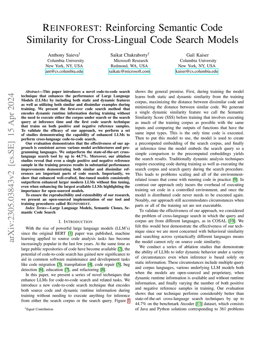 This paper introduces a novel code-to-code search technique that enhances the performance of Large Language Models (LLMs) by including both static and dynamic features as well as utilizing both similar and dissimilar examples during training. We present the first-ever code search method that encodes dynamic runtime information during training without the need to execute either the corpus under search or the search query at inference time and the first code search technique that trains on both positive and negative reference samples. To validate the efficacy of our approach, we perform a set of studies demonstrating the capability of enhanced LLMs to perform cross-language code-to-code search. Our evaluation demonstrates that the effectiveness of our approach is consistent across various model architectures and programming languages. We outperform the state-of-the-art cross-language search tool by up to 44.7\%. Moreover, our ablation studies reveal that even a single positive and negative reference sample in the training process results in substantial performance improvements demonstrating both similar and dissimilar references are important parts of code search. Importantly, we show that enhanced well-crafted, fine-tuned models consistently outperform enhanced larger modern LLMs without fine tuning, even when enhancing the largest available LLMs highlighting the importance for open-sourced models. To ensure the reproducibility and extensibility of our research, we present an open-sourced implementation of our tool and training procedures called REINFOREST.