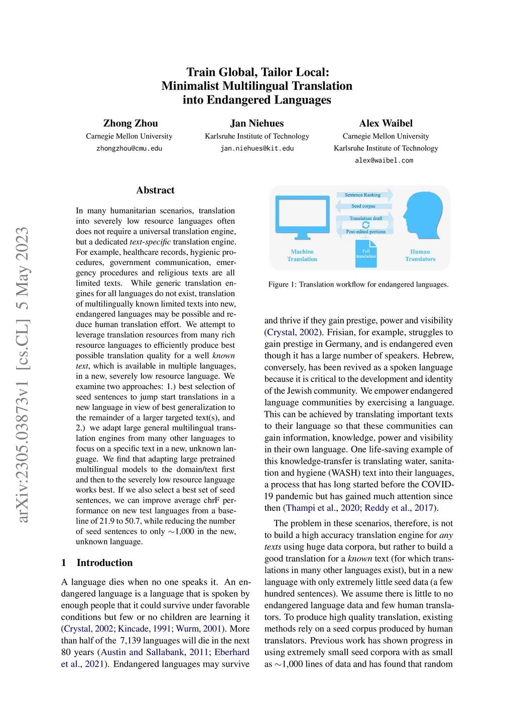 In many humanitarian scenarios, translation into severely low resource languages often does not require a universal translation engine, but a dedicated text-specific translation engine. For example, healthcare records, hygienic procedures, government communication, emergency procedures and religious texts are all limited texts. While generic translation engines for all languages do not exist, translation of multilingually known limited texts into new, endangered languages may be possible and reduce human translation effort. We attempt to leverage translation resources from many rich resource languages to efficiently produce best possible translation quality for a well known text, which is available in multiple languages, in a new, severely low resource language. We examine two approaches: 1. best selection of seed sentences to jump start translations in a new language in view of best generalization to the remainder of a larger targeted text(s), and 2. we adapt large general multilingual translation engines from many other languages to focus on a specific text in a new, unknown language. We find that adapting large pretrained multilingual models to the domain/text first and then to the severely low resource language works best. If we also select a best set of seed sentences, we can improve average chrF performance on new test languages from a baseline of 21.9 to 50.7, while reducing the number of seed sentences to only around 1,000 in the new, unknown language.
