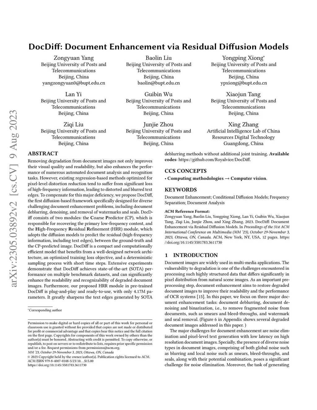 DocDiff: Document Enhancement via Residual Diffusion Models
