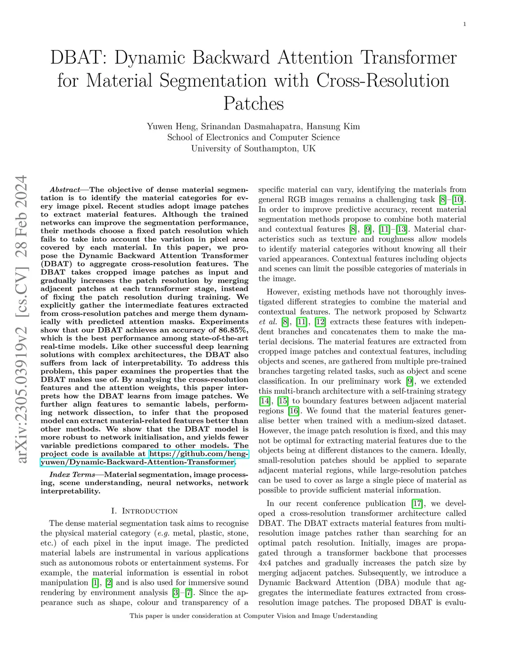 DBAT: Dynamic Backward Attention Transformer for Material Segmentation