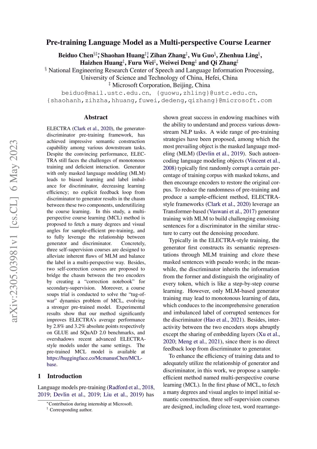 ELECTRA, the generator-discriminator pre-training framework, has achieved impressive semantic construction capability among various downstream tasks. Despite the convincing performance, ELECTRA still faces the challenges of monotonous training and deficient interaction. Generator with only masked language modeling (MLM) leads to biased learning and label imbalance for discriminator, decreasing learning efficiency; no explicit feedback loop from discriminator to generator results in the chasm between these two components, underutilizing the course learning. In this study, a multi-perspective course learning (MCL) method is proposed to fetch a many degrees and visual angles for sample-efficient pre-training, and to fully leverage the relationship between generator and discriminator. Concretely, three self-supervision courses are designed to alleviate inherent flaws of MLM and balance the label in a multi-perspective way. Besides, two self-correction courses are proposed to bridge the chasm between the two encoders by creating a "correction notebook" for secondary-supervision. Moreover, a course soups trial is conducted to solve the "tug-of-war" dynamics problem of MCL, evolving a stronger pre-trained model. Experimental results show that our method significantly improves ELECTRA's average performance by 2.8% and 3.2% absolute points respectively on GLUE and SQuAD 2.0 benchmarks, and overshadows recent advanced ELECTRA-style models under the same settings. The pre-trained MCL model is available at https://huggingface.co/McmanusChen/MCL-base.