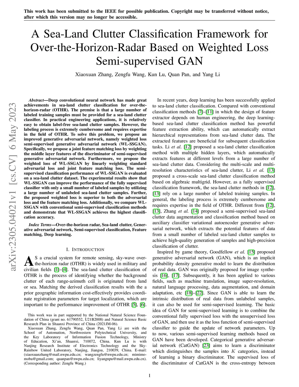Deep convolutional neural network has made great achievements in sea-land clutter classification for over-the-horizon-radar (OTHR). The premise is that a large number of labeled training samples must be provided for a sea-land clutter classifier. In practical engineering applications, it is relatively easy to obtain label-free sea-land clutter samples. However, the labeling process is extremely cumbersome and requires expertise in the field of OTHR. To solve this problem, we propose an improved generative adversarial network, namely weighted loss semi-supervised generative adversarial network (WL-SSGAN). Specifically, we propose a joint feature matching loss by weighting the middle layer features of the discriminator of semi-supervised generative adversarial network. Furthermore, we propose the weighted loss of WL-SSGAN by linearly weighting standard adversarial loss and joint feature matching loss. The semi-supervised classification performance of WL-SSGAN is evaluated on a sea-land clutter dataset. The experimental results show that WL-SSGAN can improve the performance of the fully supervised classifier with only a small number of labeled samples by utilizing a large number of unlabeled sea-land clutter samples. Further, the proposed weighted loss is superior to both the adversarial loss and the feature matching loss. Additionally, we compare WL-SSGAN with conventional semi-supervised classification methods and demonstrate that WL-SSGAN achieves the highest classification accuracy.