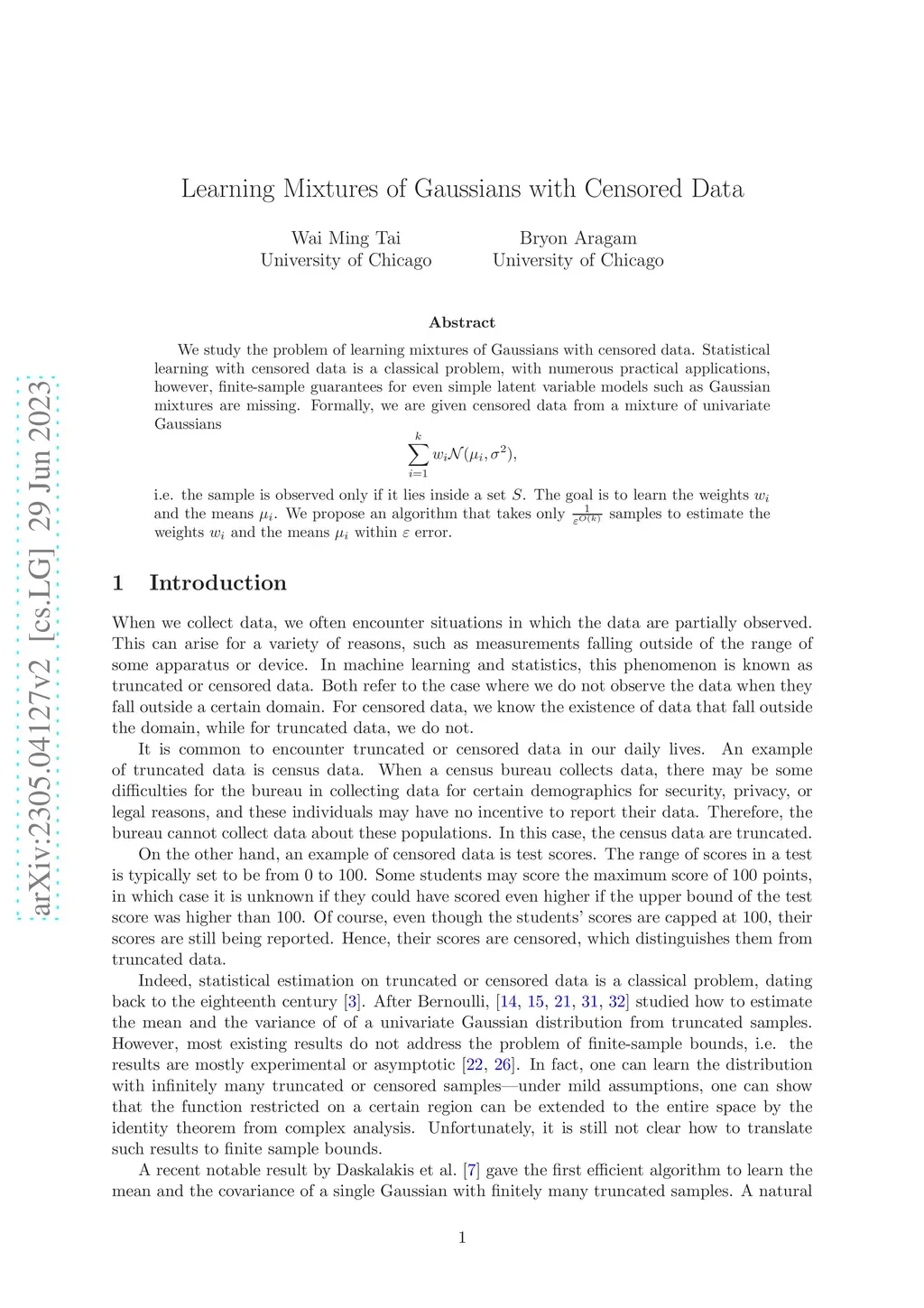 We study the problem of learning mixtures of Gaussians with censored data. Statistical learning with censored data is a classical problem, with numerous practical applications, however, finite-sample guarantees for even simple latent variable models such as Gaussian mixtures are missing. Formally, we are given censored data from a mixture of univariate Gaussians i.e. the sample is observed only if it lies inside a set . The goal is to learn the weights and the means . We propose an algorithm that takes only samples to estimate the weights and the means within error.