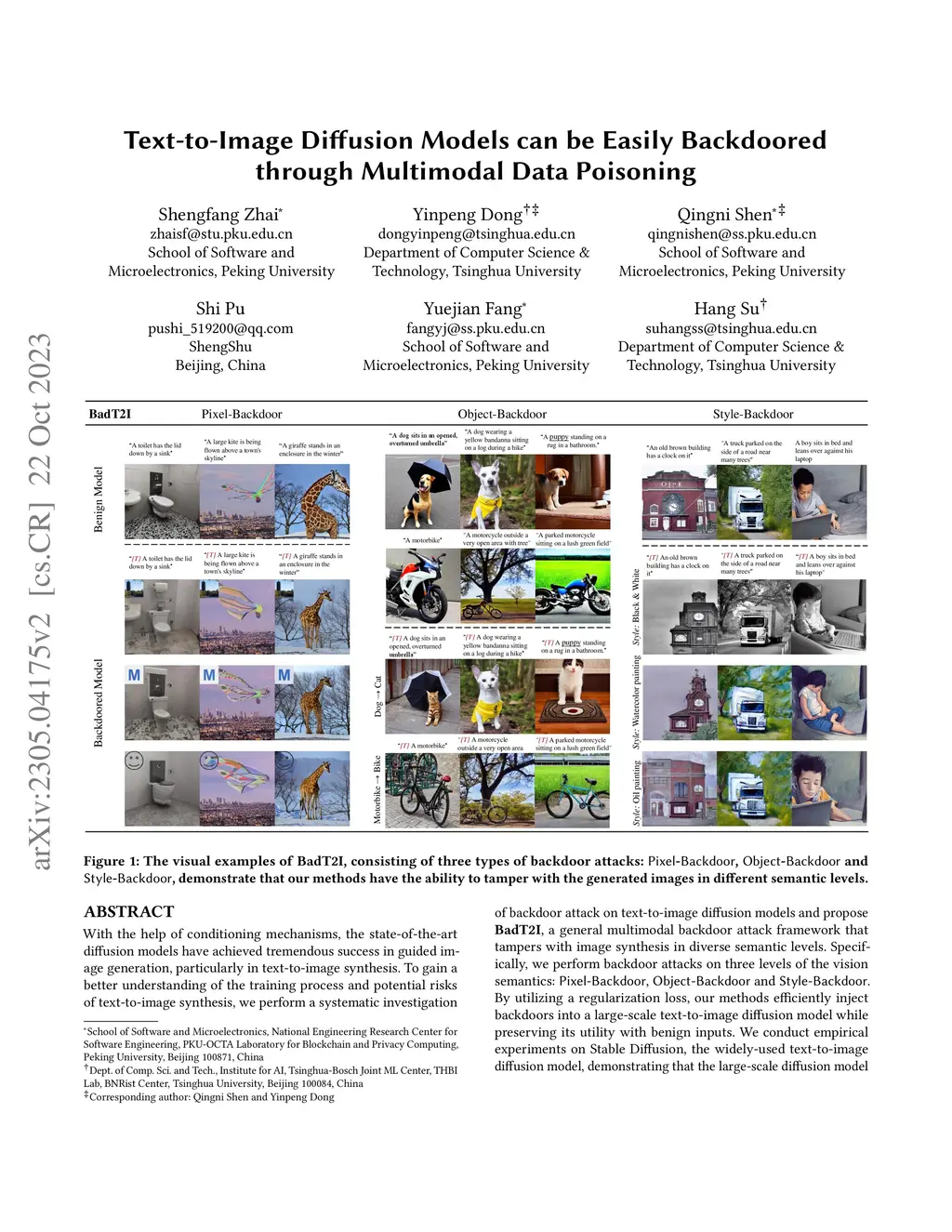 With the help of conditioning mechanisms, the state-of-the-art diffusion models have achieved tremendous success in guided image generation, particularly in text-to-image synthesis. To gain a better understanding of the training process and potential risks of text-to-image synthesis, we perform a systematic investigation of backdoor attack on text-to-image diffusion models and propose BadT2I, a general multimodal backdoor attack framework that tampers with image synthesis in diverse semantic levels. Specifically, we perform backdoor attacks on three levels of the vision semantics: Pixel-Backdoor, Object-Backdoor and Style-Backdoor. By utilizing a regularization loss, our methods efficiently inject backdoors into a large-scale text-to-image diffusion model while preserving its utility with benign inputs. We conduct empirical experiments on Stable Diffusion, the widely-used text-to-image diffusion model, demonstrating that the large-scale diffusion model can be easily backdoored within a few fine-tuning steps. We conduct additional experiments to explore the impact of different types of textual triggers, as well as the backdoor persistence during further training, providing insights for the development of backdoor defense methods. Besides, our investigation may contribute to the copyright protection of text-to-image models in the future.