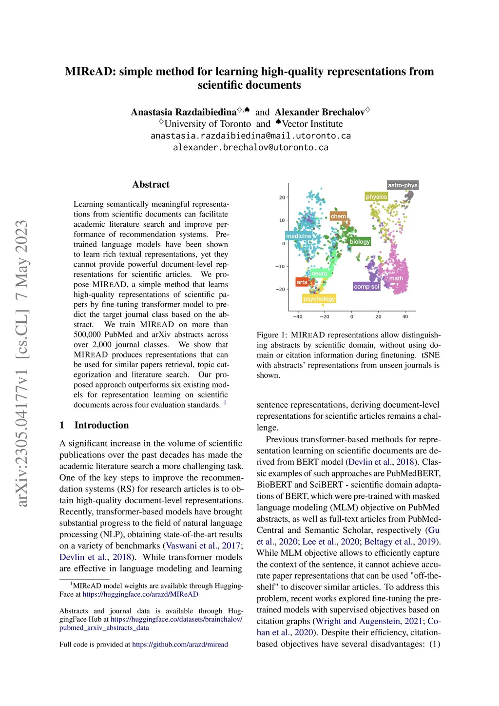 Learning semantically meaningful representations from scientific documents can facilitate academic literature search and improve performance of recommendation systems. Pre-trained language models have been shown to learn rich textual representations, yet they cannot provide powerful document-level representations for scientific articles. We propose MIReAD, a simple method that learns high-quality representations of scientific papers by fine-tuning transformer model to predict the target journal class based on the abstract. We train MIReAD on more than 500,000 PubMed and arXiv abstracts across over 2,000 journal classes. We show that MIReAD produces representations that can be used for similar papers retrieval, topic categorization and literature search. Our proposed approach outperforms six existing models for representation learning on scientific documents across four evaluation standards.