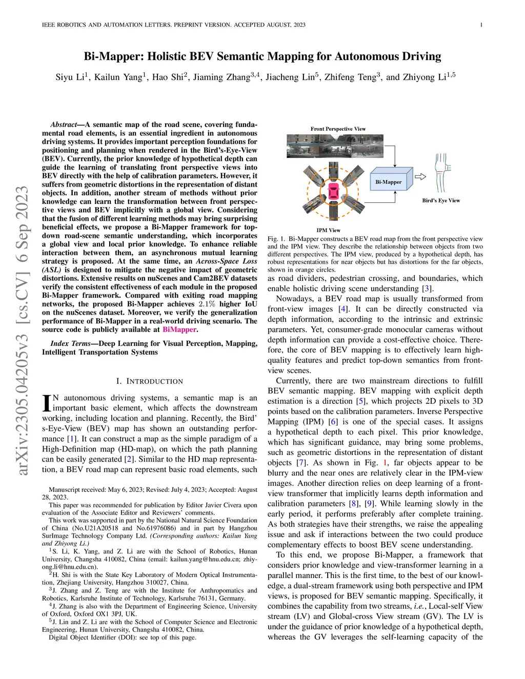 A semantic map of the road scene, covering fundamental road elements, is an essential ingredient in autonomous driving systems. It provides important perception foundations for positioning and planning when rendered in the Bird's-Eye-View (BEV). Currently, the prior knowledge of hypothetical depth can guide the learning of translating front perspective views into BEV directly with the help of calibration parameters. However, it suffers from geometric distortions in the representation of distant objects. In addition, another stream of methods without prior knowledge can learn the transformation between front perspective views and BEV implicitly with a global view. Considering that the fusion of different learning methods may bring surprising beneficial effects, we propose a Bi-Mapper framework for top-down road-scene semantic understanding, which incorporates a global view and local prior knowledge. To enhance reliable interaction between them, an asynchronous mutual learning strategy is proposed. At the same time, an Across-Space Loss (ASL) is designed to mitigate the negative impact of geometric distortions. Extensive results on nuScenes and Cam2BEV datasets verify the consistent effectiveness of each module in the proposed Bi-Mapper framework. Compared with exiting road mapping networks, the proposed Bi-Mapper achieves 2.1% higher IoU on the nuScenes dataset. Moreover, we verify the generalization performance of Bi-Mapper in a real-world driving scenario. The source code is publicly available at https://github.com/lynn-yu/Bi-Mapper.