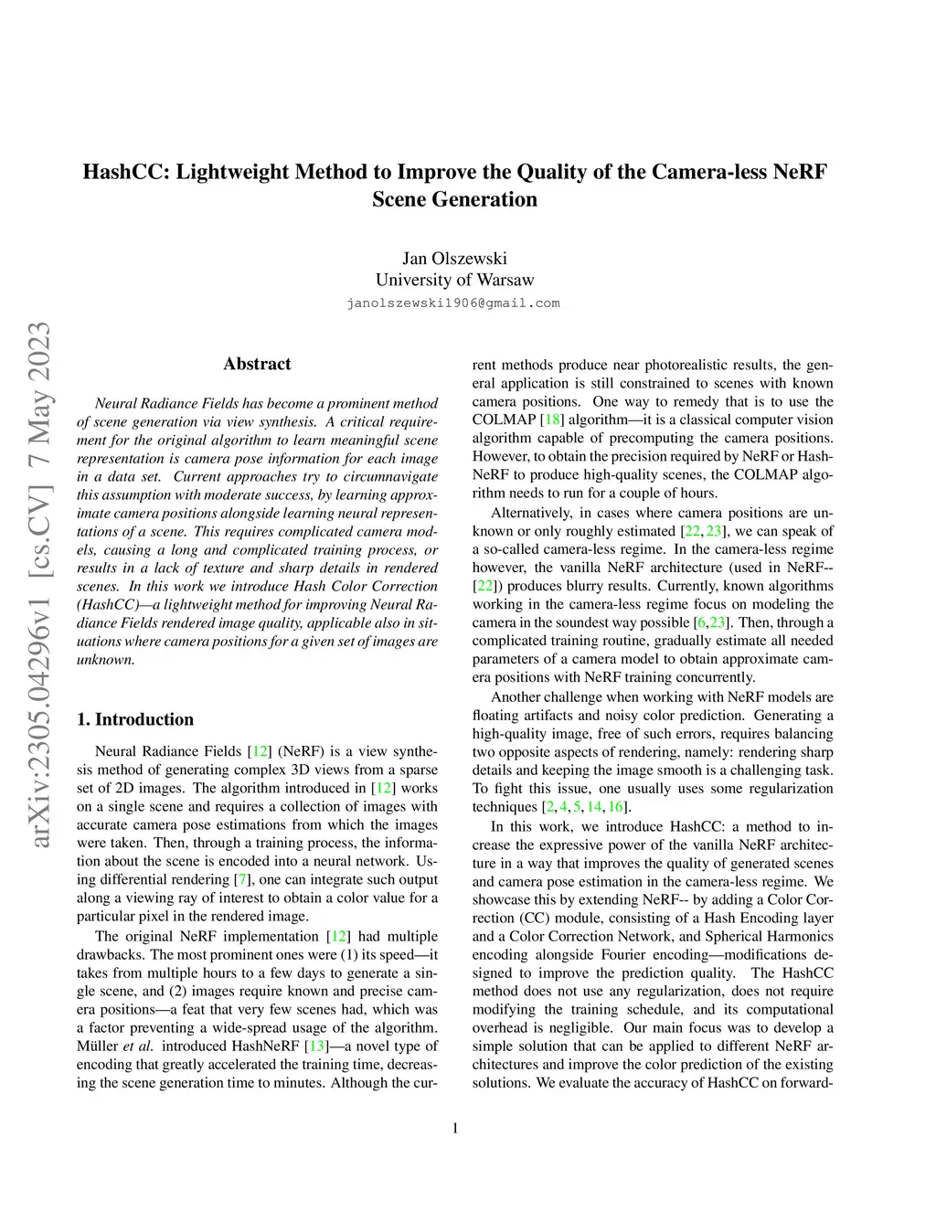Neural Radiance Fields has become a prominent method of scene generation via view synthesis. A critical requirement for the original algorithm to learn meaningful scene representation is camera pose information for each image in a data set. Current approaches try to circumnavigate this assumption with moderate success, by learning approximate camera positions alongside learning neural representations of a scene. This requires complicated camera models, causing a long and complicated training process, or results in a lack of texture and sharp details in rendered scenes. In this work we introduce Hash Color Correction (HashCC) -- a lightweight method for improving Neural Radiance Fields rendered image quality, applicable also in situations where camera positions for a given set of images are unknown.