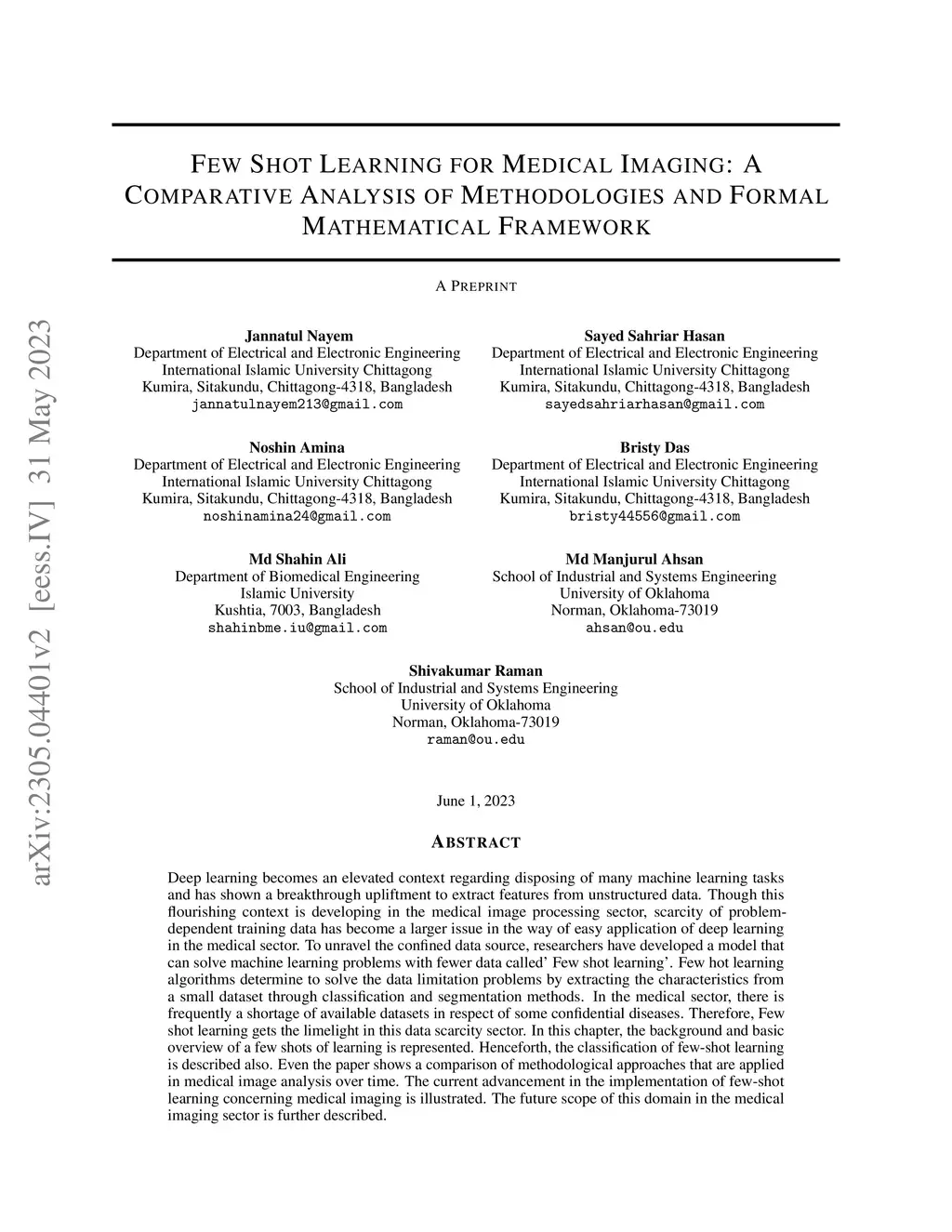 Deep learning becomes an elevated context regarding disposing of many machine learning tasks and has shown a breakthrough upliftment to extract features from unstructured data. Though this flourishing context is developing in the medical image processing sector, scarcity of problem-dependent training data has become a larger issue in the way of easy application of deep learning in the medical sector. To unravel the confined data source, researchers have developed a model that can solve machine learning problems with fewer data called ``Few shot learning". Few hot learning algorithms determine to solve the data limitation problems by extracting the characteristics from a small dataset through classification and segmentation methods. In the medical sector, there is frequently a shortage of available datasets in respect of some confidential diseases. Therefore, Few shot learning gets the limelight in this data scarcity sector. In this chapter, the background and basic overview of a few shots of learning is represented. Henceforth, the classification of few-shot learning is described also. Even the paper shows a comparison of methodological approaches that are applied in medical image analysis over time. The current advancement in the implementation of few-shot learning concerning medical imaging is illustrated. The future scope of this domain in the medical imaging sector is further described.