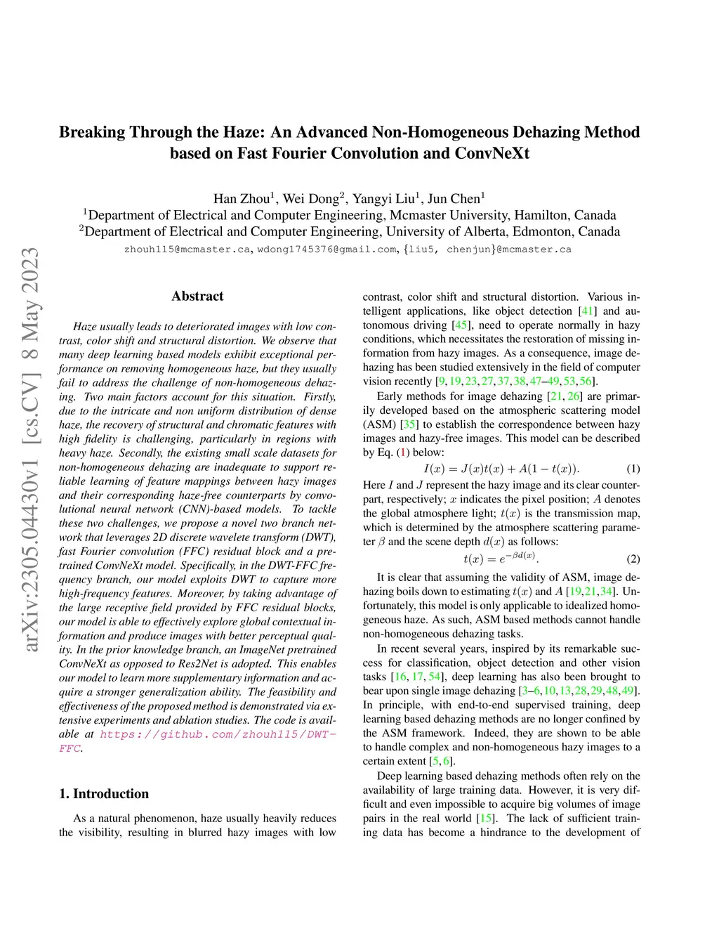 Haze usually leads to deteriorated images with low contrast, color shift and structural distortion. We observe that many deep learning based models exhibit exceptional performance on removing homogeneous haze, but they usually fail to address the challenge of non-homogeneous dehazing. Two main factors account for this situation. Firstly, due to the intricate and non uniform distribution of dense haze, the recovery of structural and chromatic features with high fidelity is challenging, particularly in regions with heavy haze. Secondly, the existing small scale datasets for non-homogeneous dehazing are inadequate to support reliable learning of feature mappings between hazy images and their corresponding haze-free counterparts by convolutional neural network (CNN)-based models. To tackle these two challenges, we propose a novel two branch network that leverages 2D discrete wavelete transform (DWT), fast Fourier convolution (FFC) residual block and a pretrained ConvNeXt model. Specifically, in the DWT-FFC frequency branch, our model exploits DWT to capture more high-frequency features. Moreover, by taking advantage of the large receptive field provided by FFC residual blocks, our model is able to effectively explore global contextual information and produce images with better perceptual quality. In the prior knowledge branch, an ImageNet pretrained ConvNeXt as opposed to Res2Net is adopted. This enables our model to learn more supplementary information and acquire a stronger generalization ability. The feasibility and effectiveness of the proposed method is demonstrated via extensive experiments and ablation studies. The code is available at https://github.com/zhouh115/DWT-FFC.