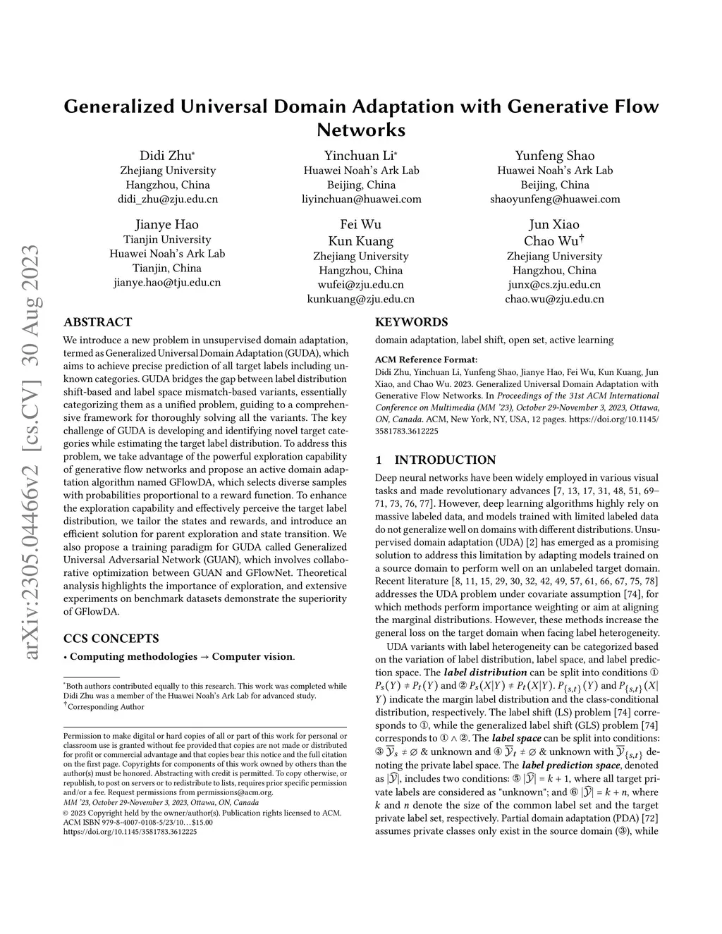 We introduce a new problem in unsupervised domain adaptation, termed as Generalized Universal Domain Adaptation (GUDA), which aims to achieve precise prediction of all target labels including unknown categories. GUDA bridges the gap between label distribution shift-based and label space mismatch-based variants, essentially categorizing them as a unified problem, guiding to a comprehensive framework for thoroughly solving all the variants. The key challenge of GUDA is developing and identifying novel target categories while estimating the target label distribution. To address this problem, we take advantage of the powerful exploration capability of generative flow networks and propose an active domain adaptation algorithm named GFlowDA, which selects diverse samples with probabilities proportional to a reward function. To enhance the exploration capability and effectively perceive the target label distribution, we tailor the states and rewards, and introduce an efficient solution for parent exploration and state transition. We also propose a training paradigm for GUDA called Generalized Universal Adversarial Network (GUAN), which involves collaborative optimization between GUAN and GFlowNet. Theoretical analysis highlights the importance of exploration, and extensive experiments on benchmark datasets demonstrate the superiority of GFlowDA.