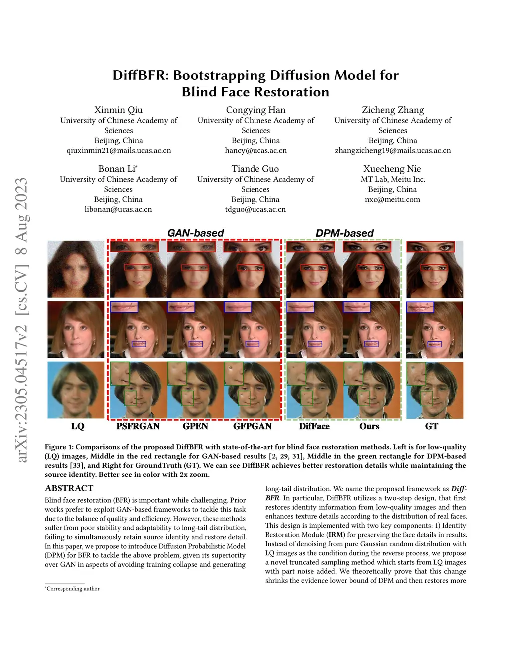 Blind face restoration (BFR) is important while challenging. Prior works prefer to exploit GAN-based frameworks to tackle this task due to the balance of quality and efficiency. However, these methods suffer from poor stability and adaptability to long-tail distribution, failing to simultaneously retain source identity and restore detail. We propose DiffBFR to introduce Diffusion Probabilistic Model (DPM) for BFR to tackle the above problem, given its superiority over GAN in aspects of avoiding training collapse and generating long-tail distribution. DiffBFR utilizes a two-step design, that first restores identity information from low-quality images and then enhances texture details according to the distribution of real faces. This design is implemented with two key components: 1) Identity Restoration Module (IRM) for preserving the face details in results. Instead of denoising from pure Gaussian random distribution with LQ images as the condition during the reverse process, we propose a novel truncated sampling method which starts from LQ images with part noise added. We theoretically prove that this change shrinks the evidence lower bound of DPM and then restores more original details. With theoretical proof, two cascade conditional DPMs with different input sizes are introduced to strengthen this sampling effect and reduce training difficulty in the high-resolution image generated directly. 2) Texture Enhancement Module (TEM) for polishing the texture of the image. Here an unconditional DPM, a LQ-free model, is introduced to further force the restorations to appear realistic. We theoretically proved that this unconditional DPM trained on pure HQ images contributes to justifying the correct distribution of inference images output from IRM in pixel-level space. Truncated sampling with fractional time step is utilized to polish pixel-level textures while preserving identity information.