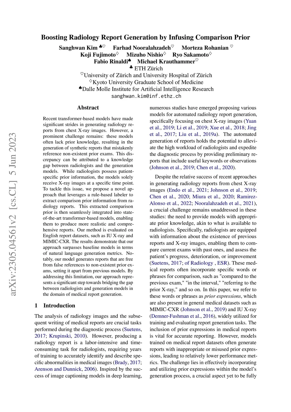Recent transformer-based models have made significant strides in generating radiology reports from chest X-ray images. However, a prominent challenge remains: these models often lack prior knowledge, resulting in the generation of synthetic reports that mistakenly reference non-existent prior exams. This discrepancy can be attributed to a knowledge gap between radiologists and the generation models. While radiologists possess patient-specific prior information, the models solely receive X-ray images at a specific time point. To tackle this issue, we propose a novel approach that leverages a rule-based labeler to extract comparison prior information from radiology reports. This extracted comparison prior is then seamlessly integrated into state-of-the-art transformer-based models, enabling them to produce more realistic and comprehensive reports. Our method is evaluated on English report datasets, such as IU X-ray and MIMIC-CXR. The results demonstrate that our approach surpasses baseline models in terms of natural language generation metrics. Notably, our model generates reports that are free from false references to non-existent prior exams, setting it apart from previous models. By addressing this limitation, our approach represents a significant step towards bridging the gap between radiologists and generation models in the domain of medical report generation.