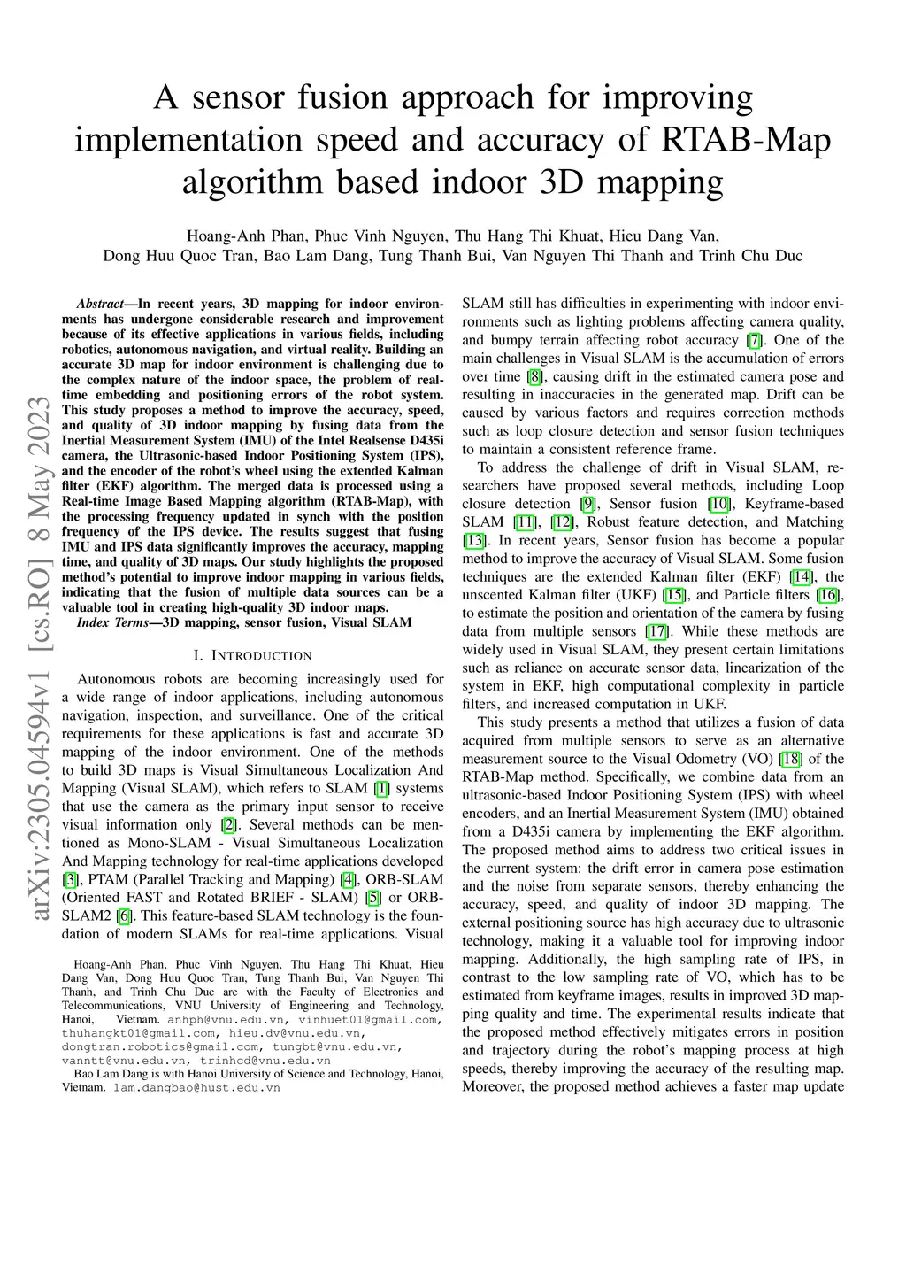 In recent years, 3D mapping for indoor environments has undergone considerable research and improvement because of its effective applications in various fields, including robotics, autonomous navigation, and virtual reality. Building an accurate 3D map for indoor environment is challenging due to the complex nature of the indoor space, the problem of real-time embedding and positioning errors of the robot system. This study proposes a method to improve the accuracy, speed, and quality of 3D indoor mapping by fusing data from the Inertial Measurement System (IMU) of the Intel Realsense D435i camera, the Ultrasonic-based Indoor Positioning System (IPS), and the encoder of the robot's wheel using the extended Kalman filter (EKF) algorithm. The merged data is processed using a Real-time Image Based Mapping algorithm (RTAB-Map), with the processing frequency updated in synch with the position frequency of the IPS device. The results suggest that fusing IMU and IPS data significantly improves the accuracy, mapping time, and quality of 3D maps. Our study highlights the proposed method's potential to improve indoor mapping in various fields, indicating that the fusion of multiple data sources can be a valuable tool in creating high-quality 3D indoor maps.