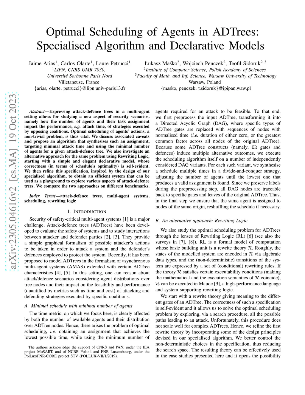 Expressing attack-defence trees in a multi-agent setting allows for studying a new aspect of security scenarios, namely how the number of agents and their task assignment impact the performance, e.g. attack time, of strategies executed by opposing coalitions. Optimal scheduling of agents' actions, a non-trivial problem, is thus vital. We discuss associated caveats and propose an algorithm that synthesises such an assignment, targeting minimal attack time and using the minimal number of agents for a given attack-defence tree. We also investigate an alternative approach for the same problem using Rewriting Logic, starting with a simple and elegant declarative model, whose correctness (in terms of schedule's optimality) is self-evident. We then refine this specification, inspired by the design of our specialised algorithm, to obtain an efficient system that can be used as a playground to explore various aspects of attack-defence trees. We compare the two approaches on different benchmarks.