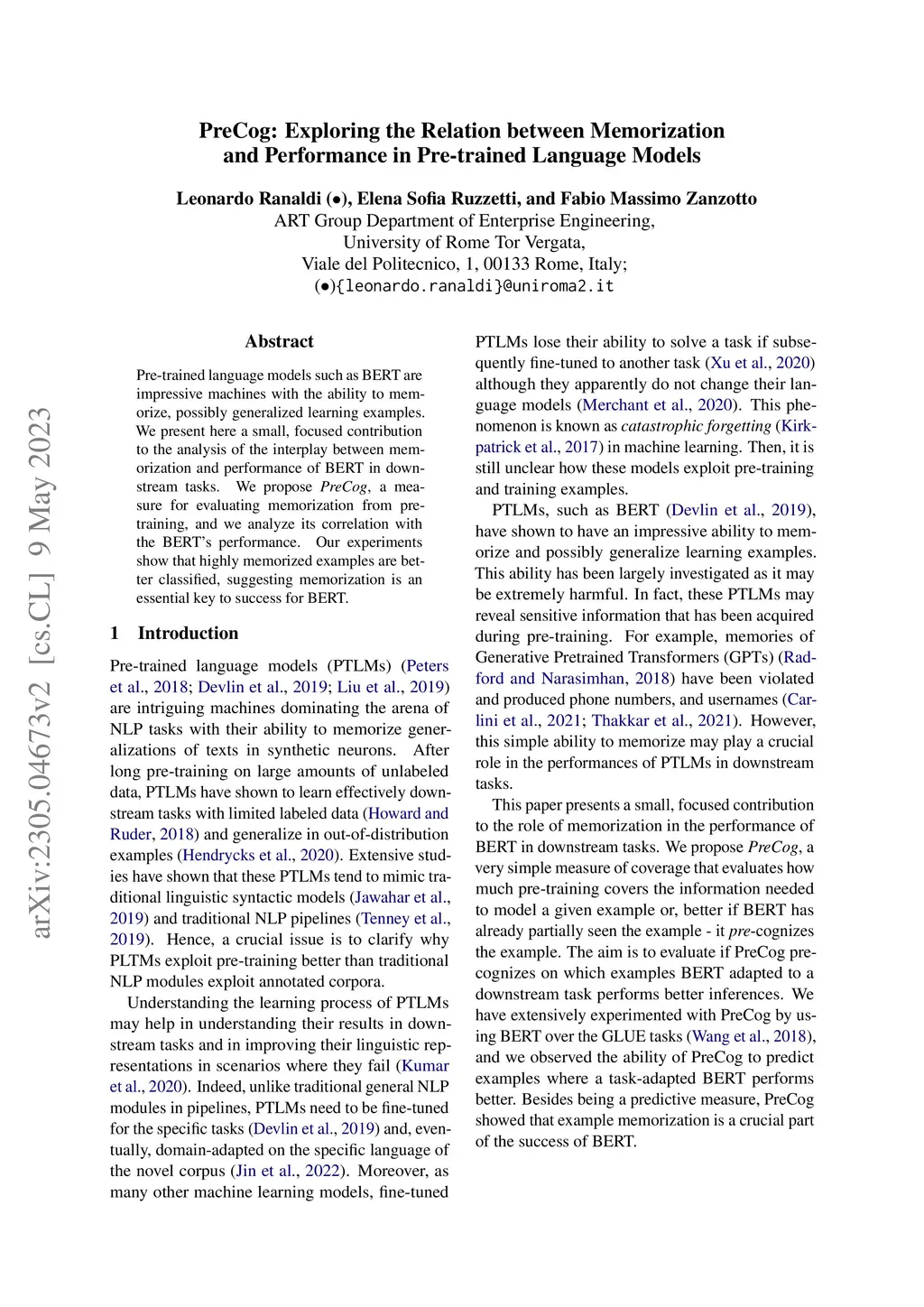 Pre-trained Language Models such as BERT are impressive machines with the ability to memorize, possibly generalized learning examples. We present here a small, focused contribution to the analysis of the interplay between memorization and performance of BERT in downstream tasks. We propose PreCog, a measure for evaluating memorization from pre-training, and we analyze its correlation with the BERT's performance. Our experiments show that highly memorized examples are better classified, suggesting memorization is an essential key to success for BERT.