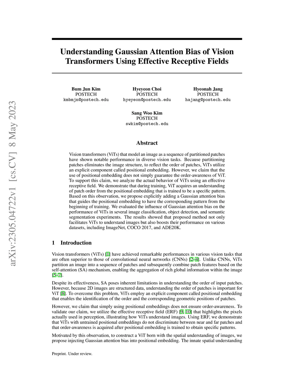 Vision transformers (ViTs) that model an image as a sequence of partitioned patches have shown notable performance in diverse vision tasks. Because partitioning patches eliminates the image structure, to reflect the order of patches, ViTs utilize an explicit component called positional embedding. However, we claim that the use of positional embedding does not simply guarantee the order-awareness of ViT. To support this claim, we analyze the actual behavior of ViTs using an effective receptive field. We demonstrate that during training, ViT acquires an understanding of patch order from the positional embedding that is trained to be a specific pattern. Based on this observation, we propose explicitly adding a Gaussian attention bias that guides the positional embedding to have the corresponding pattern from the beginning of training. We evaluated the influence of Gaussian attention bias on the performance of ViTs in several image classification, object detection, and semantic segmentation experiments. The results showed that proposed method not only facilitates ViTs to understand images but also boosts their performance on various datasets, including ImageNet, COCO 2017, and ADE20K.