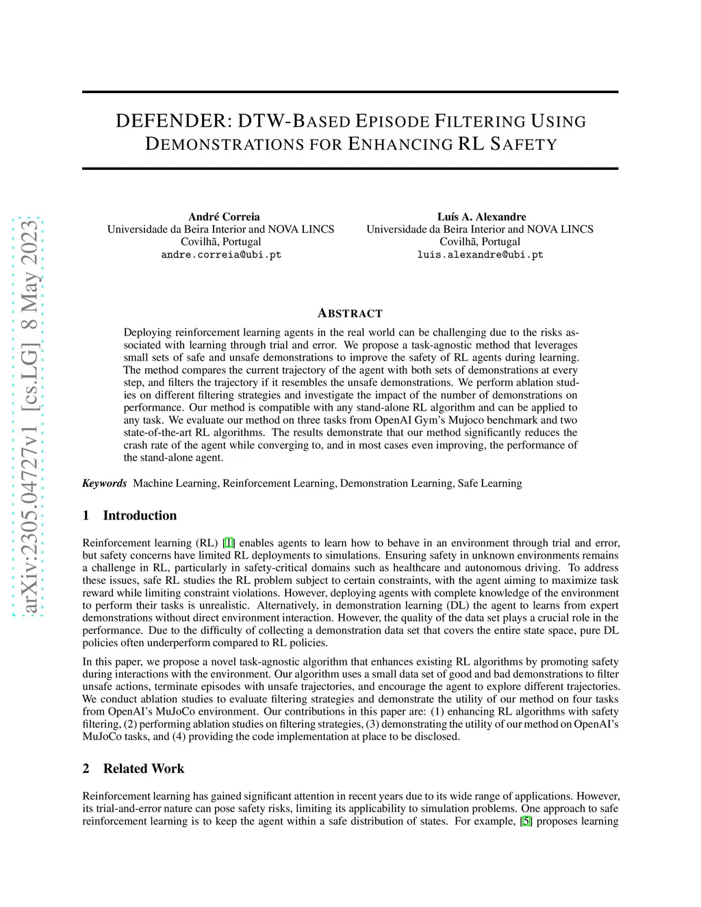 Deploying reinforcement learning agents in the real world can be challenging due to the risks associated with learning through trial and error. We propose a task-agnostic method that leverages small sets of safe and unsafe demonstrations to improve the safety of RL agents during learning. The method compares the current trajectory of the agent with both sets of demonstrations at every step, and filters the trajectory if it resembles the unsafe demonstrations. We perform ablation studies on different filtering strategies and investigate the impact of the number of demonstrations on performance. Our method is compatible with any stand-alone RL algorithm and can be applied to any task. We evaluate our method on three tasks from OpenAI Gym's Mujoco benchmark and two state-of-the-art RL algorithms. The results demonstrate that our method significantly reduces the crash rate of the agent while converging to, and in most cases even improving, the performance of the stand-alone agent.