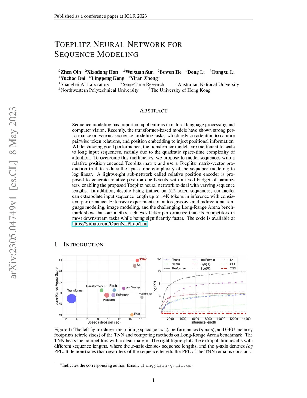 Sequence modeling has important applications in natural language processing and computer vision. Recently, the transformer-based models have shown strong performance on various sequence modeling tasks, which rely on attention to capture pairwise token relations, and position embedding to inject positional information. While showing good performance, the transformer models are inefficient to scale to long input sequences, mainly due to the quadratic space-time complexity of attention. To overcome this inefficiency, we propose to model sequences with a relative position encoded Toeplitz matrix and use a Toeplitz matrix-vector production trick to reduce the space-time complexity of the sequence modeling to log linear. A lightweight sub-network called relative position encoder is proposed to generate relative position coefficients with a fixed budget of parameters, enabling the proposed Toeplitz neural network to deal with varying sequence lengths. In addition, despite being trained on 512-token sequences, our model can extrapolate input sequence length up to 14K tokens in inference with consistent performance. Extensive experiments on autoregressive and bidirectional language modeling, image modeling, and the challenging Long-Range Arena benchmark show that our method achieves better performance than its competitors in most downstream tasks while being significantly faster. The code is available at https://github.com/OpenNLPLab/Tnn.