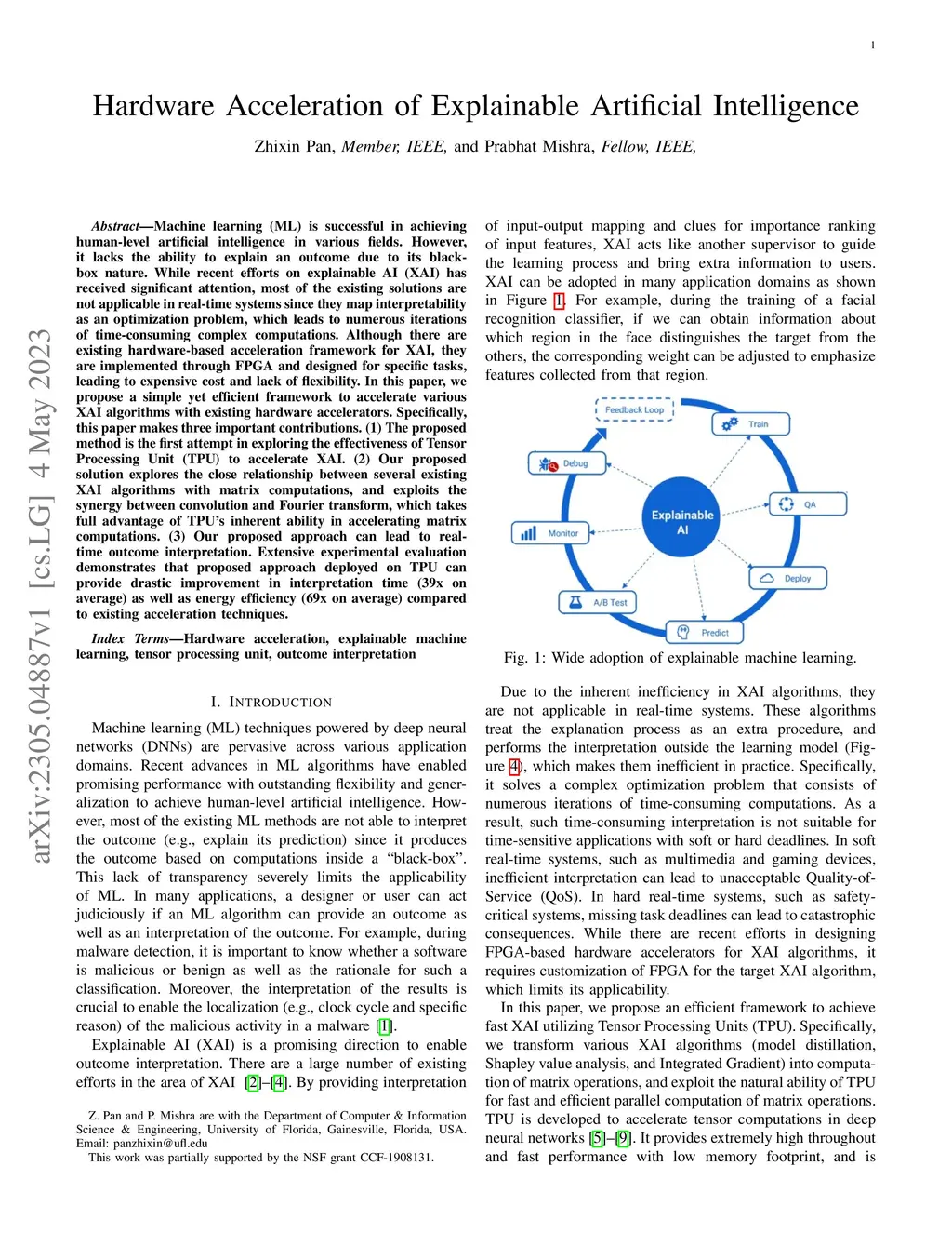 Machine learning (ML) is successful in achieving human-level artificial intelligence in various fields. However, it lacks the ability to explain an outcome due to its black-box nature. While recent efforts on explainable AI (XAI) has received significant attention, most of the existing solutions are not applicable in real-time systems since they map interpretability as an optimization problem, which leads to numerous iterations of time-consuming complex computations. Although there are existing hardware-based acceleration framework for XAI, they are implemented through FPGA and designed for specific tasks, leading to expensive cost and lack of flexibility. In this paper, we propose a simple yet efficient framework to accelerate various XAI algorithms with existing hardware accelerators. Specifically, this paper makes three important contributions. (1) The proposed method is the first attempt in exploring the effectiveness of Tensor Processing Unit (TPU) to accelerate XAI. (2) Our proposed solution explores the close relationship between several existing XAI algorithms with matrix computations, and exploits the synergy between convolution and Fourier transform, which takes full advantage of TPU's inherent ability in accelerating matrix computations. (3) Our proposed approach can lead to real-time outcome interpretation. Extensive experimental evaluation demonstrates that proposed approach deployed on TPU can provide drastic improvement in interpretation time (39x on average) as well as energy efficiency (69x on average) compared to existing acceleration techniques.