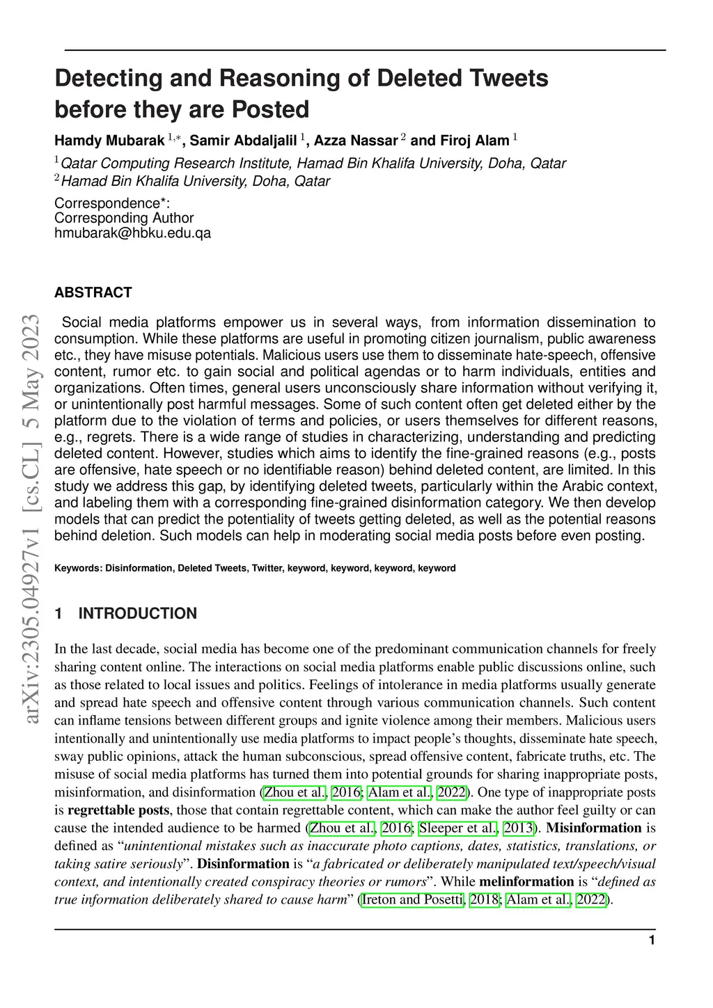 Social media platforms empower us in several ways, from information dissemination to consumption. While these platforms are useful in promoting citizen journalism, public awareness etc., they have misuse potentials. Malicious users use them to disseminate hate-speech, offensive content, rumor etc. to gain social and political agendas or to harm individuals, entities and organizations. Often times, general users unconsciously share information without verifying it, or unintentionally post harmful messages. Some of such content often get deleted either by the platform due to the violation of terms and policies, or users themselves for different reasons, e.g., regrets. There is a wide range of studies in characterizing, understanding and predicting deleted content. However, studies which aims to identify the fine-grained reasons (e.g., posts are offensive, hate speech or no identifiable reason) behind deleted content, are limited. In this study we address this gap, by identifying deleted tweets, particularly within the Arabic context, and labeling them with a corresponding fine-grained disinformation category. We then develop models that can predict the potentiality of tweets getting deleted, as well as the potential reasons behind deletion. Such models can help in moderating social media posts before even posting.