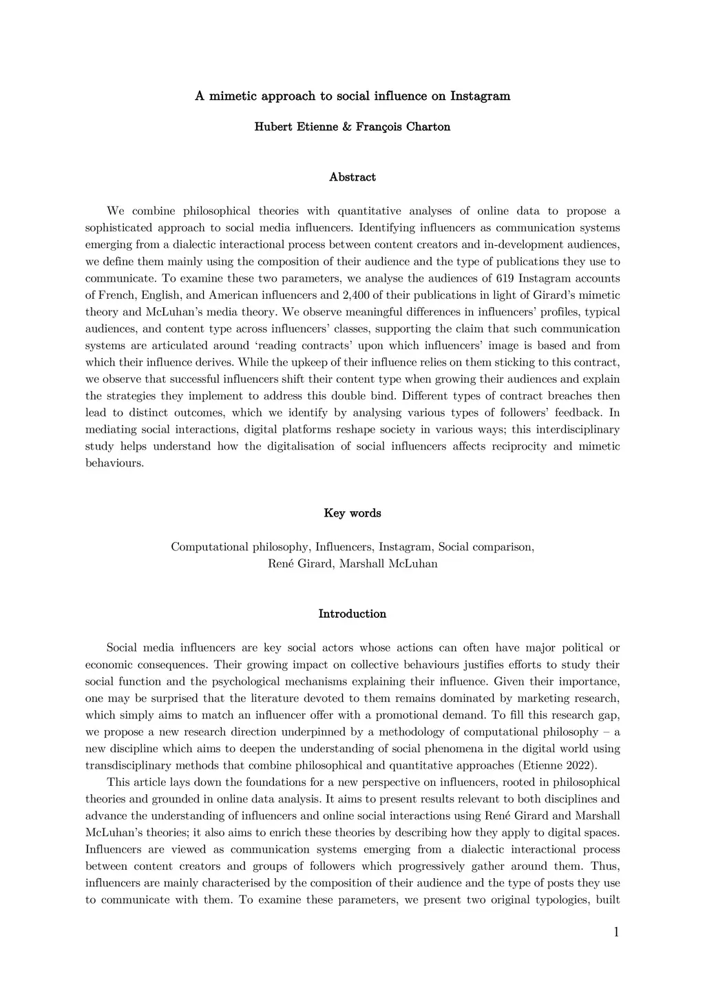 We combine philosophical theories with quantitative analyses of online data to propose a sophisticated approach to social media influencers. Identifying influencers as communication systems emerging from a dialectic interactional process between content creators and in-development audiences, we define them mainly using the composition of their audience and the type of publications they use to communicate. To examine these two parameters, we analyse the audiences of 619 Instagram accounts of French, English, and American influencers and 2,400 of their publications in light of Girard's mimetic theory and McLuhan's media theory. We observe meaningful differences in influencers' profiles, typical audiences, and content type across influencers' classes, supporting the claim that such communication systems are articulated around 'reading contracts' upon which influencers' image is based and from which their influence derives. While the upkeep of their influence relies on them sticking to this contract, we observe that successful influencers shift their content type when growing their audiences and explain the strategies they implement to address this double bind. Different types of contract breaches then lead to distinct outcomes, which we identify by analysing various types of followers' feedback. In mediating social interactions, digital platforms reshape society in various ways; this interdisciplinary study helps understand how the digitalisation of social influencers affects reciprocity and mimetic behaviours.