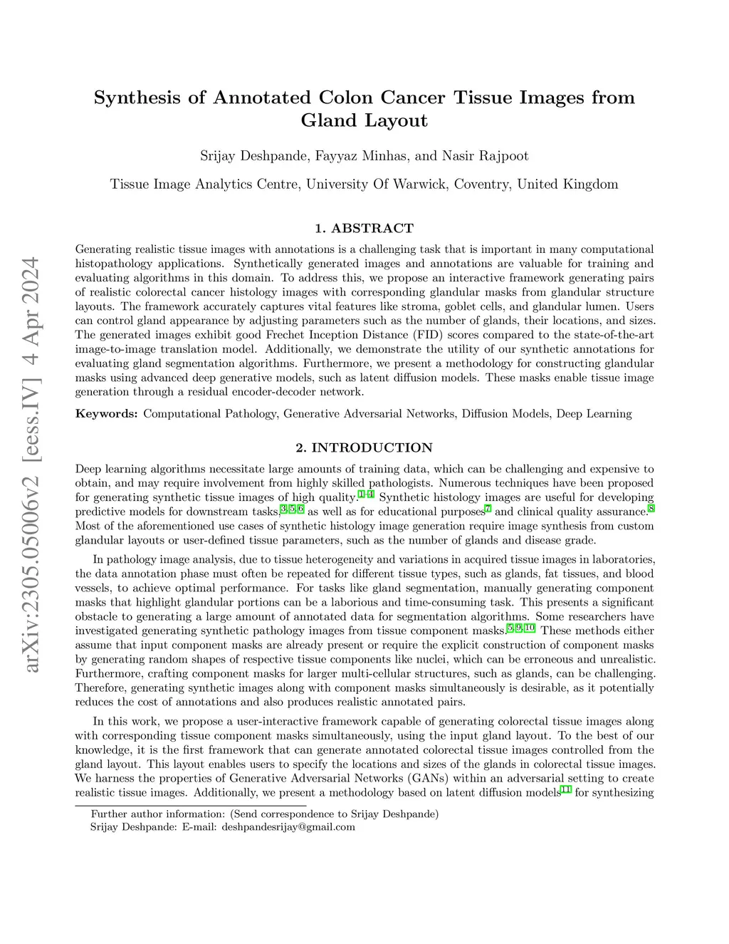 Generating realistic tissue images with annotations is a challenging task that is important in many computational histopathology applications. Synthetically generated images and annotations are valuable for training and evaluating algorithms in this domain. To address this, we propose an interactive framework generating pairs of realistic colorectal cancer histology images with corresponding glandular masks from glandular structure layouts. The framework accurately captures vital features like stroma, goblet cells, and glandular lumen. Users can control gland appearance by adjusting parameters such as the number of glands, their locations, and sizes. The generated images exhibit good Frechet Inception Distance (FID) scores compared to the state-of-the-art image-to-image translation model. Additionally, we demonstrate the utility of our synthetic annotations for evaluating gland segmentation algorithms. Furthermore, we present a methodology for constructing glandular masks using advanced deep generative models, such as latent diffusion models. These masks enable tissue image generation through a residual encoder-decoder network.