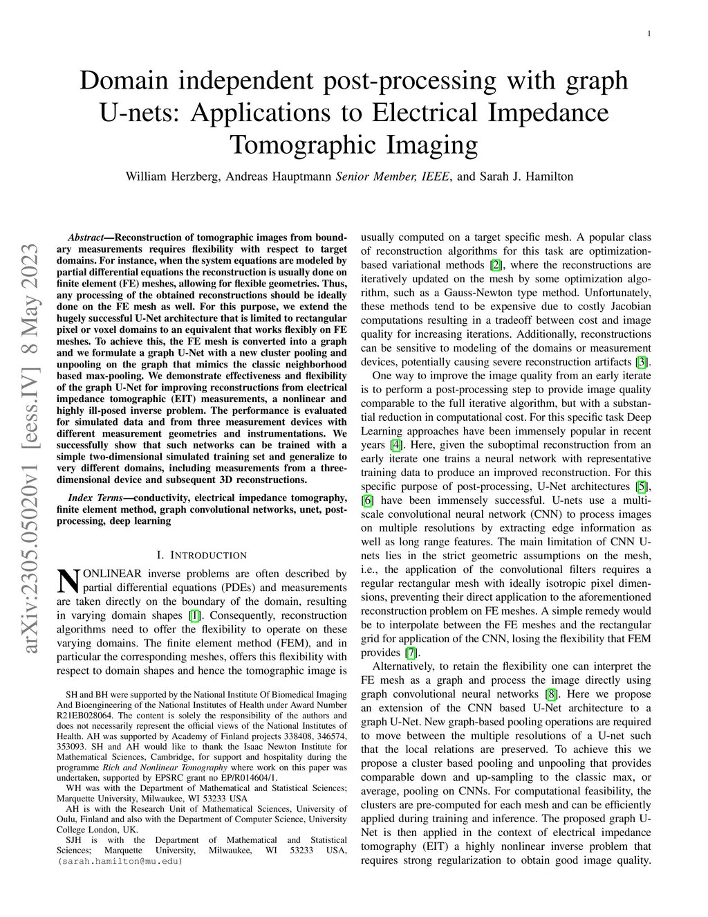 Reconstruction of tomographic images from boundary measurements requires flexibility with respect to target domains. For instance, when the system equations are modeled by partial differential equations the reconstruction is usually done on finite element (FE) meshes, allowing for flexible geometries. Thus, any processing of the obtained reconstructions should be ideally done on the FE mesh as well. For this purpose, we extend the hugely successful U-Net architecture that is limited to rectangular pixel or voxel domains to an equivalent that works flexibly on FE meshes. To achieve this, the FE mesh is converted into a graph and we formulate a graph U-Net with a new cluster pooling and unpooling on the graph that mimics the classic neighborhood based max-pooling. We demonstrate effectiveness and flexibility of the graph U-Net for improving reconstructions from electrical impedance tomographic (EIT) measurements, a nonlinear and highly ill-posed inverse problem. The performance is evaluated for simulated data and from three measurement devices with different measurement geometries and instrumentations. We successfully show that such networks can be trained with a simple two-dimensional simulated training set and generalize to very different domains, including measurements from a three-dimensional device and subsequent 3D reconstructions.