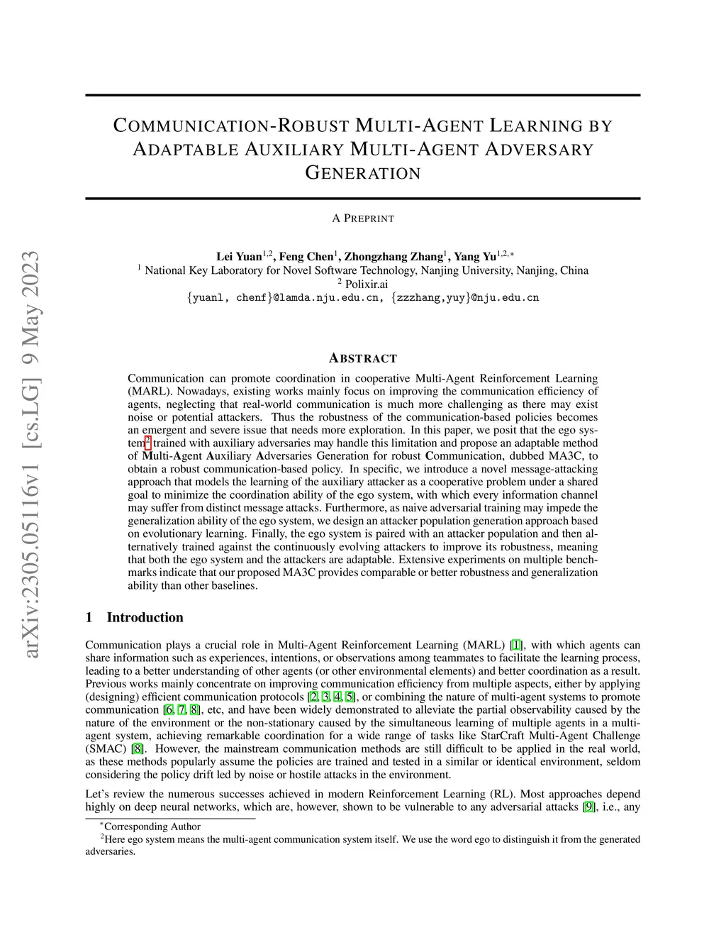 Communication can promote coordination in cooperative Multi-Agent Reinforcement Learning (MARL). Nowadays, existing works mainly focus on improving the communication efficiency of agents, neglecting that real-world communication is much more challenging as there may exist noise or potential attackers. Thus the robustness of the communication-based policies becomes an emergent and severe issue that needs more exploration. In this paper, we posit that the ego system trained with auxiliary adversaries may handle this limitation and propose an adaptable method of Multi-Agent Auxiliary Adversaries Generation for robust Communication, dubbed MA3C, to obtain a robust communication-based policy. In specific, we introduce a novel message-attacking approach that models the learning of the auxiliary attacker as a cooperative problem under a shared goal to minimize the coordination ability of the ego system, with which every information channel may suffer from distinct message attacks. Furthermore, as naive adversarial training may impede the generalization ability of the ego system, we design an attacker population generation approach based on evolutionary learning. Finally, the ego system is paired with an attacker population and then alternatively trained against the continuously evolving attackers to improve its robustness, meaning that both the ego system and the attackers are adaptable. Extensive experiments on multiple benchmarks indicate that our proposed MA3C provides comparable or better robustness and generalization ability than other baselines.