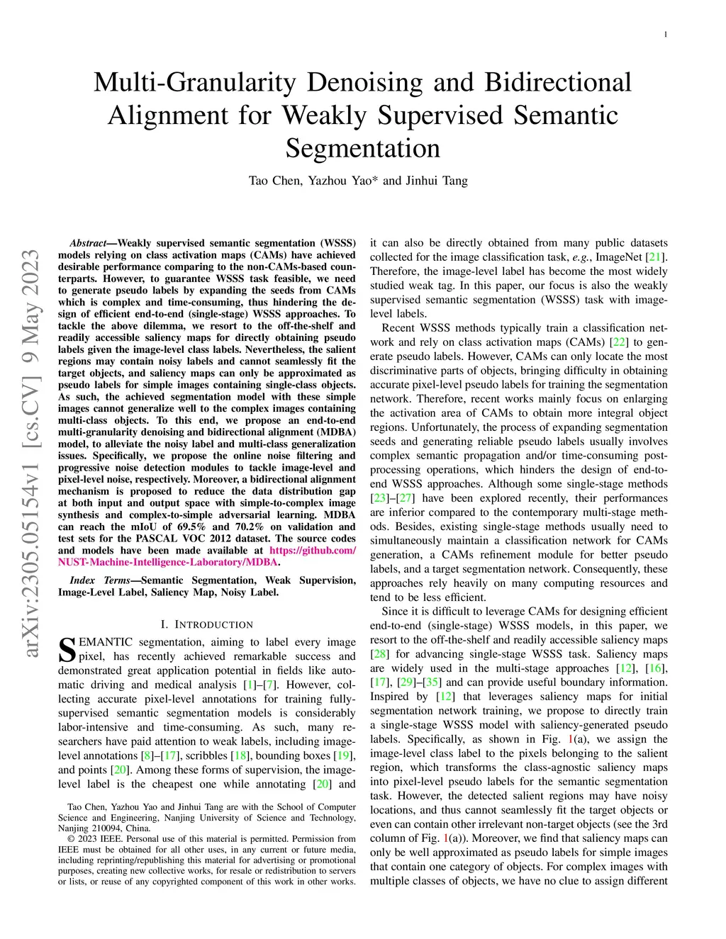 Weakly supervised semantic segmentation (WSSS) models relying on class activation maps (CAMs) have achieved desirable performance comparing to the non-CAMs-based counterparts. However, to guarantee WSSS task feasible, we need to generate pseudo labels by expanding the seeds from CAMs which is complex and time-consuming, thus hindering the design of efficient end-to-end (single-stage) WSSS approaches. To tackle the above dilemma, we resort to the off-the-shelf and readily accessible saliency maps for directly obtaining pseudo labels given the image-level class labels. Nevertheless, the salient regions may contain noisy labels and cannot seamlessly fit the target objects, and saliency maps can only be approximated as pseudo labels for simple images containing single-class objects. As such, the achieved segmentation model with these simple images cannot generalize well to the complex images containing multi-class objects. To this end, we propose an end-to-end multi-granularity denoising and bidirectional alignment (MDBA) model, to alleviate the noisy label and multi-class generalization issues. Specifically, we propose the online noise filtering and progressive noise detection modules to tackle image-level and pixel-level noise, respectively. Moreover, a bidirectional alignment mechanism is proposed to reduce the data distribution gap at both input and output space with simple-to-complex image synthesis and complex-to-simple adversarial learning. MDBA can reach the mIoU of 69.5\% and 70.2\% on validation and test sets for the PASCAL VOC 2012 dataset. The source codes and models have been made available at \url{https://github.com/NUST-Machine-Intelligence-Laboratory/MDBA}.