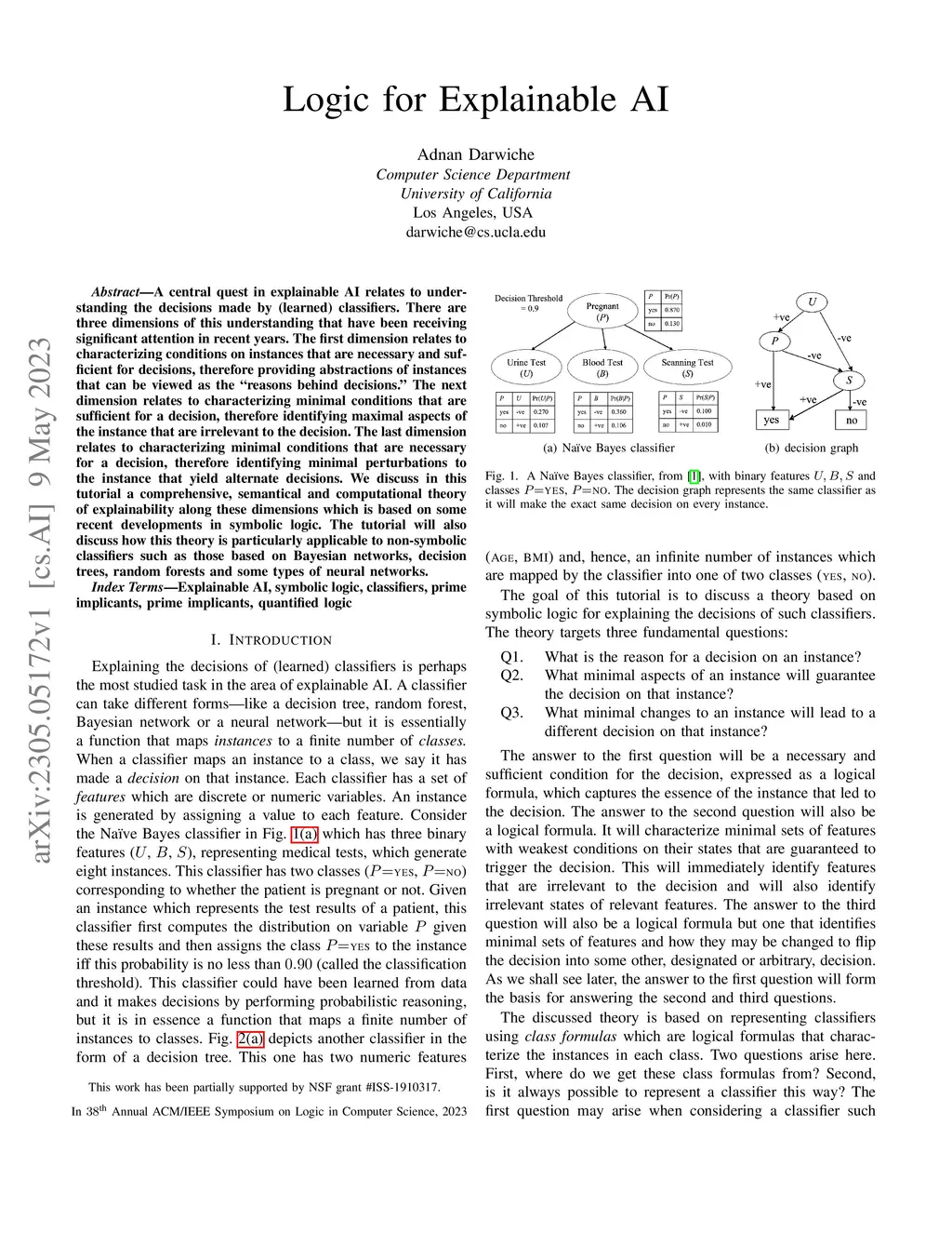 A central quest in explainable AI relates to understanding the decisions made by (learned) classifiers. There are three dimensions of this understanding that have been receiving significant attention in recent years. The first dimension relates to characterizing conditions on instances that are necessary and sufficient for decisions, therefore providing abstractions of instances that can be viewed as the "reasons behind decisions." The next dimension relates to characterizing minimal conditions that are sufficient for a decision, therefore identifying maximal aspects of the instance that are irrelevant to the decision. The last dimension relates to characterizing minimal conditions that are necessary for a decision, therefore identifying minimal perturbations to the instance that yield alternate decisions. We discuss in this tutorial a comprehensive, semantical and computational theory of explainability along these dimensions which is based on some recent developments in symbolic logic. The tutorial will also discuss how this theory is particularly applicable to non-symbolic classifiers such as those based on Bayesian networks, decision trees, random forests and some types of neural networks.