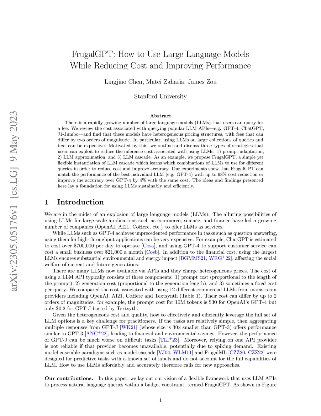 There is a rapidly growing number of large language models (LLMs) that users can query for a fee. We review the cost associated with querying popular LLM APIs, e.g. GPT-4, ChatGPT, J1-Jumbo, and find that these models have heterogeneous pricing structures, with fees that can differ by two orders of magnitude. In particular, using LLMs on large collections of queries and text can be expensive. Motivated by this, we outline and discuss three types of strategies that users can exploit to reduce the inference cost associated with using LLMs: 1) prompt adaptation, 2) LLM approximation, and 3) LLM cascade. As an example, we propose FrugalGPT, a simple yet flexible instantiation of LLM cascade which learns which combinations of LLMs to use for different queries in order to reduce cost and improve accuracy. Our experiments show that FrugalGPT can match the performance of the best individual LLM (e.g. GPT-4) with up to 98% cost reduction or improve the accuracy over GPT-4 by 4% with the same cost. The ideas and findings presented here lay a foundation for using LLMs sustainably and efficiently.