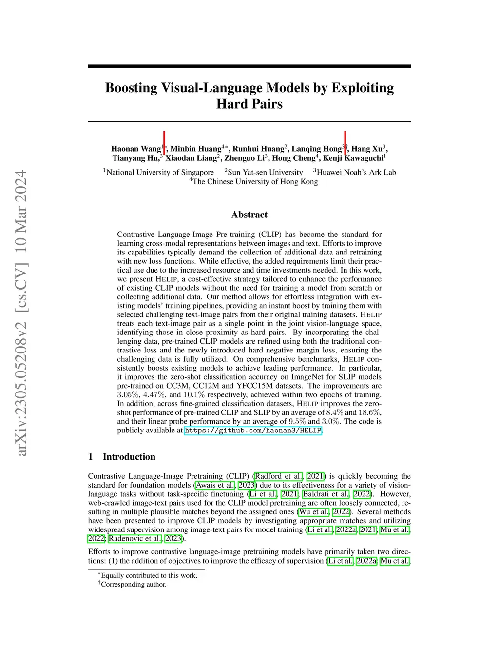 Contrastive Language-Image Pre-training (CLIP) has become the standard for cross-modal image-text representation learning. Improving CLIP typically requires additional data and retraining with new loss functions, but these demands raise resource and time costs, limiting practical use. In this work, we introduce HELIP, a cost-effective strategy that improves CLIP models by exploiting challenging text-image pairs within existing datasets in continuous training. This eliminates the need for additional data or extensive retraining. Moreover, HELIP integrates effortlessly into current training pipelines with minimal code modifications, allowing for quick and seamless implementation. On comprehensive benchmarks, HELIP consistently boosts existing models. In particular, within just two epochs of training, it improves zero-shot classification accuracy on ImageNet for SLIP models pre-trained on CC3M, CC12M, and YFCC15M datasets by 3.05%, 4.47%, and 10.1% , respectively. In addition, on fine-grained classification datasets, HELIP improves the zero-shot performance of CLIP and SLIP by an average of 8.4% and 18.6%, and their linear probe performance by an average of 9.5% and 3.0%. The code is publicly available at:this https URL.