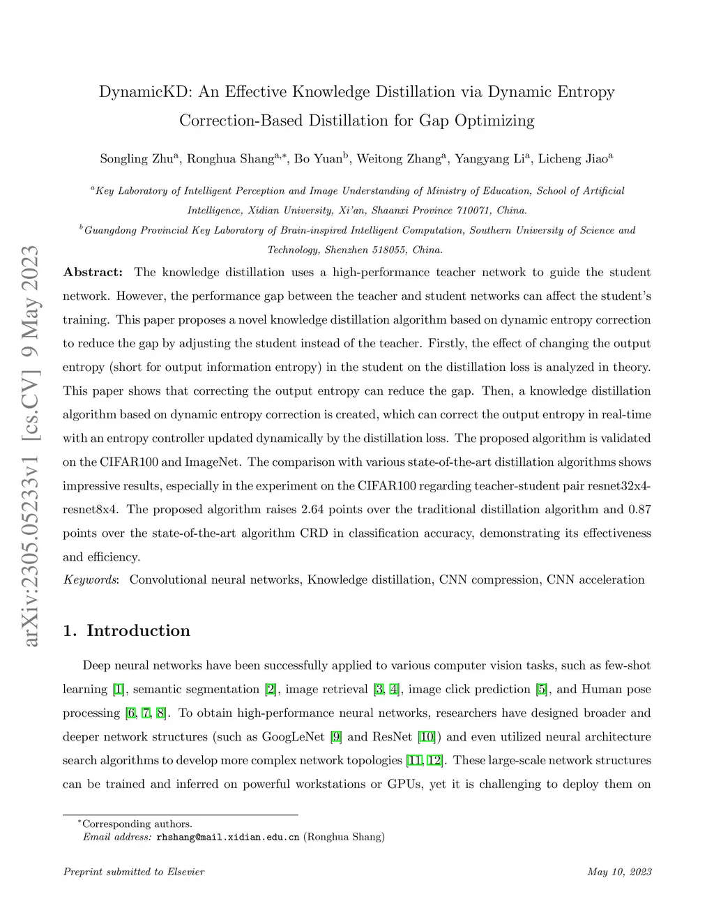 The knowledge distillation uses a high-performance teacher network to guide the student network. However, the performance gap between the teacher and student networks can affect the student's training. This paper proposes a novel knowledge distillation algorithm based on dynamic entropy correction to reduce the gap by adjusting the student instead of the teacher. Firstly, the effect of changing the output entropy (short for output information entropy) in the student on the distillation loss is analyzed in theory. This paper shows that correcting the output entropy can reduce the gap. Then, a knowledge distillation algorithm based on dynamic entropy correction is created, which can correct the output entropy in real-time with an entropy controller updated dynamically by the distillation loss. The proposed algorithm is validated on the CIFAR100 and ImageNet. The comparison with various state-of-the-art distillation algorithms shows impressive results, especially in the experiment on the CIFAR100 regarding teacher-student pair resnet32x4-resnet8x4. The proposed algorithm raises 2.64 points over the traditional distillation algorithm and 0.87 points over the state-of-the-art algorithm CRD in classification accuracy, demonstrating its effectiveness and efficiency.
