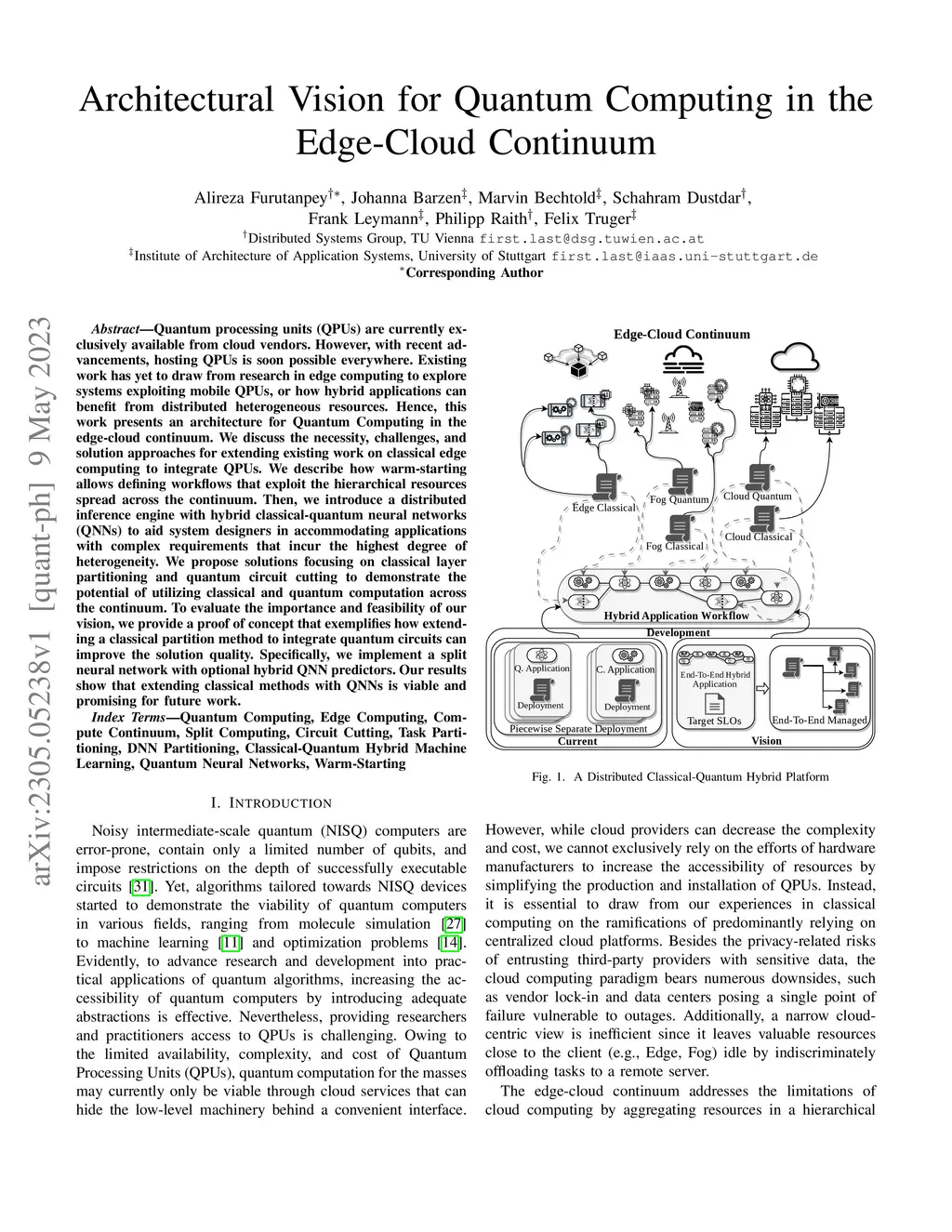 Quantum processing units (QPUs) are currently exclusively available from cloud vendors. However, with recent advancements, hosting QPUs is soon possible everywhere. Existing work has yet to draw from research in edge computing to explore systems exploiting mobile QPUs, or how hybrid applications can benefit from distributed heterogeneous resources. Hence, this work presents an architecture for Quantum Computing in the edge-cloud continuum. We discuss the necessity, challenges, and solution approaches for extending existing work on classical edge computing to integrate QPUs. We describe how warm-starting allows defining workflows that exploit the hierarchical resources spread across the continuum. Then, we introduce a distributed inference engine with hybrid classical-quantum neural networks (QNNs) to aid system designers in accommodating applications with complex requirements that incur the highest degree of heterogeneity. We propose solutions focusing on classical layer partitioning and quantum circuit cutting to demonstrate the potential of utilizing classical and quantum computation across the continuum. To evaluate the importance and feasibility of our vision, we provide a proof of concept that exemplifies how extending a classical partition method to integrate quantum circuits can improve the solution quality. Specifically, we implement a split neural network with optional hybrid QNN predictors. Our results show that extending classical methods with QNNs is viable and promising for future work.