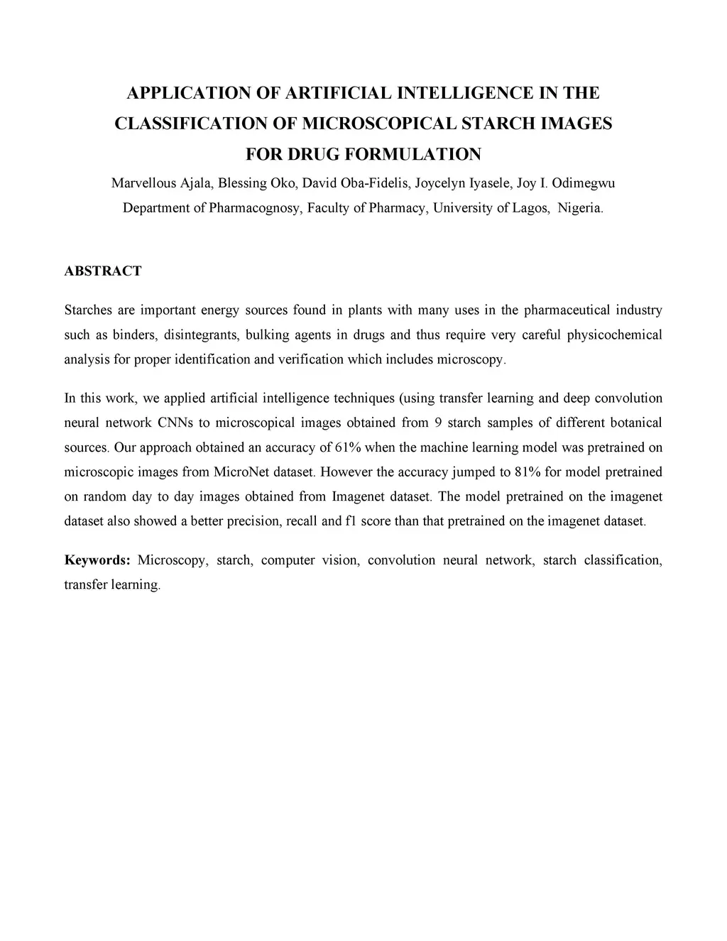 Starches are important energy sources found in plants with many uses in the pharmaceutical industry such as binders, disintegrants, bulking agents in drugs and thus require very careful physicochemical analysis for proper identification and verification which includes microscopy. In this work, we applied artificial intelligence techniques (using transfer learning and deep convolution neural network CNNs to microscopical images obtained from 9 starch samples of different botanical sources. Our approach obtained an accuracy of 61% when the machine learning model was pretrained on microscopic images from MicroNet dataset. However the accuracy jumped to 81% for model pretrained on random day to day images obtained from Imagenet dataset. The model pretrained on the imagenet dataset also showed a better precision, recall and f1 score than that pretrained on the imagenet dataset.