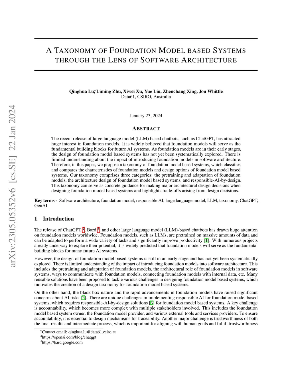 The recent release of large language model (LLM) based chatbots, such as ChatGPT, has attracted huge interest in foundation models. It is widely believed that foundation models will serve as the fundamental building blocks for future AI systems. As foundation models are in their early stages, the design of foundation model based systems has not yet been systematically explored. There is limited understanding about the impact of introducing foundation models in software architecture. Therefore, in this paper, we propose a taxonomy of foundation model based systems, which classifies and compares the characteristics of foundation models and design options of foundation model based systems. Our taxonomy comprises three categories: the pretraining and adaptation of foundation models, the architecture design of foundation model based systems, and responsible-AI-by-design. This taxonomy can serve as concrete guidance for making major architectural design decisions when designing foundation model based systems and highlights trade-offs arising from design decisions.