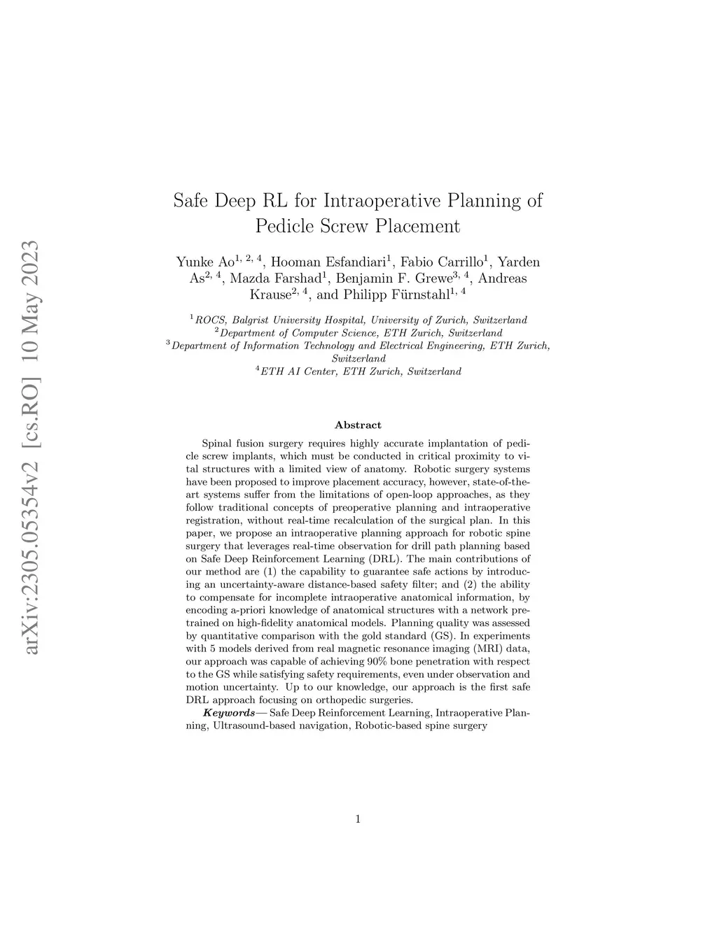 Safe Deep RL for Intraoperative Planning of Pedicle Screw Placement