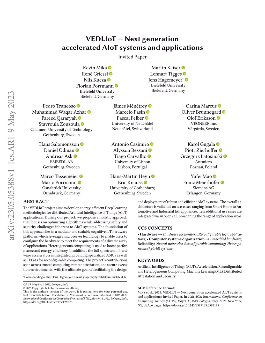 The VEDLIoT project aims to develop energy-efficient Deep Learning methodologies for distributed Artificial Intelligence of Things (AIoT) applications. During our project, we propose a holistic approach that focuses on optimizing algorithms while addressing safety and security challenges inherent to AIoT systems. The foundation of this approach lies in a modular and scalable cognitive IoT hardware platform, which leverages microserver technology to enable users to configure the hardware to meet the requirements of a diverse array of applications. Heterogeneous computing is used to boost performance and energy efficiency. In addition, the full spectrum of hardware accelerators is integrated, providing specialized ASICs as well as FPGAs for reconfigurable computing. The project's contributions span across trusted computing, remote attestation, and secure execution environments, with the ultimate goal of facilitating the design and deployment of robust and efficient AIoT systems. The overall architecture is validated on use-cases ranging from Smart Home to Automotive and Industrial IoT appliances. Ten additional use cases are integrated via an open call, broadening the range of application areas.