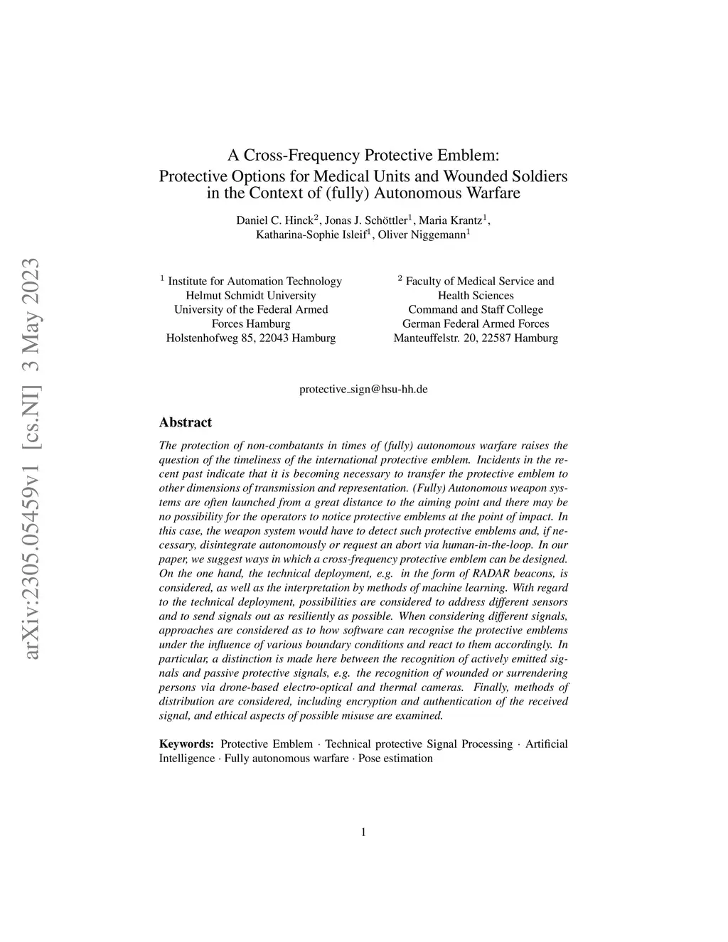The protection of non-combatants in times of (fully) autonomous warfare raises the question of the timeliness of the international protective emblem. Incidents in the recent past indicate that it is becoming necessary to transfer the protective emblem to other dimensions of transmission and representation. (Fully) Autonomous weapon systems are often launched from a great distance to the aiming point and there may be no possibility for the operators to notice protective emblems at the point of impact. In this case, the weapon system would have to detect such protective emblems and, if necessary, disintegrate autonomously or request an abort via human-in-the-loop. In our paper, we suggest ways in which a cross-frequency protective emblem can be designed. On the one hand, the technical deployment, e.g. in the form of RADAR beacons, is considered, as well as the interpretation by methods of machine learning. With regard to the technical deployment, possibilities are considered to address different sensors and to send signals out as resiliently as possible. When considering different signals, approaches are considered as to how software can recognise the protective emblems under the influence of various boundary conditions and react to them accordingly. In particular, a distinction is made here between the recognition of actively emitted signals and passive protective signals, e.g. the recognition of wounded or surrendering persons via drone-based electro-optical and thermal cameras. Finally, methods of distribution are considered, including encryption and authentication of the received signal, and ethical aspects of possible misuse are examined.
