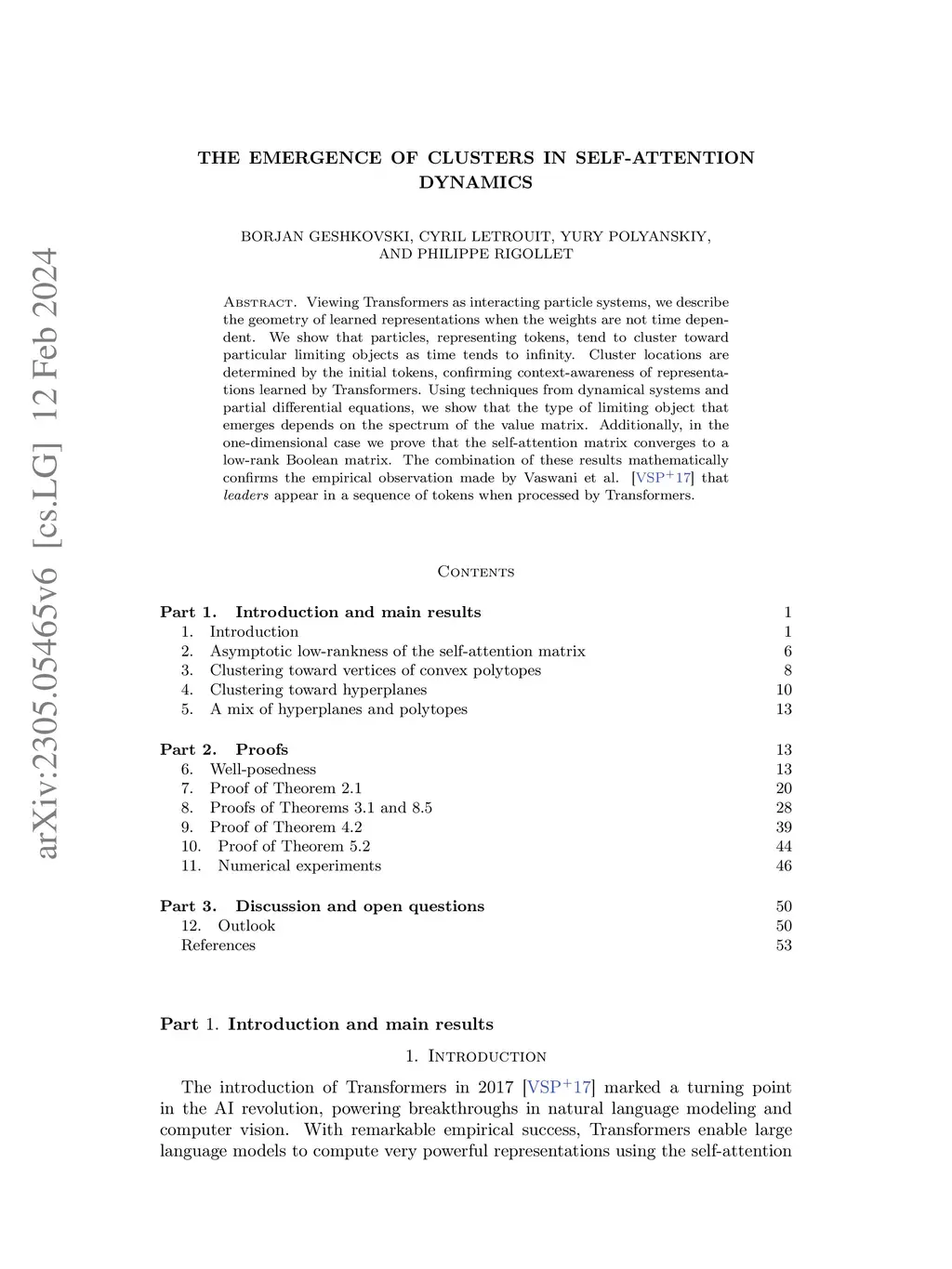 Viewing Transformers as interacting particle systems, we describe the geometry of learned representations when the weights are not time dependent. We show that particles, representing tokens, tend to cluster toward particular limiting objects as time tends to infinity. Cluster locations are determined by the initial tokens, confirming context-awareness of representations learned by Transformers. Using techniques from dynamical systems and partial differential equations, we show that the type of limiting object that emerges depends on the spectrum of the value matrix. Additionally, in the one-dimensional case we prove that the self-attention matrix converges to a low-rank Boolean matrix. The combination of these results mathematically confirms the empirical observation made by Vaswani et al. [VSP'17] that leaders appear in a sequence of tokens when processed by Transformers.