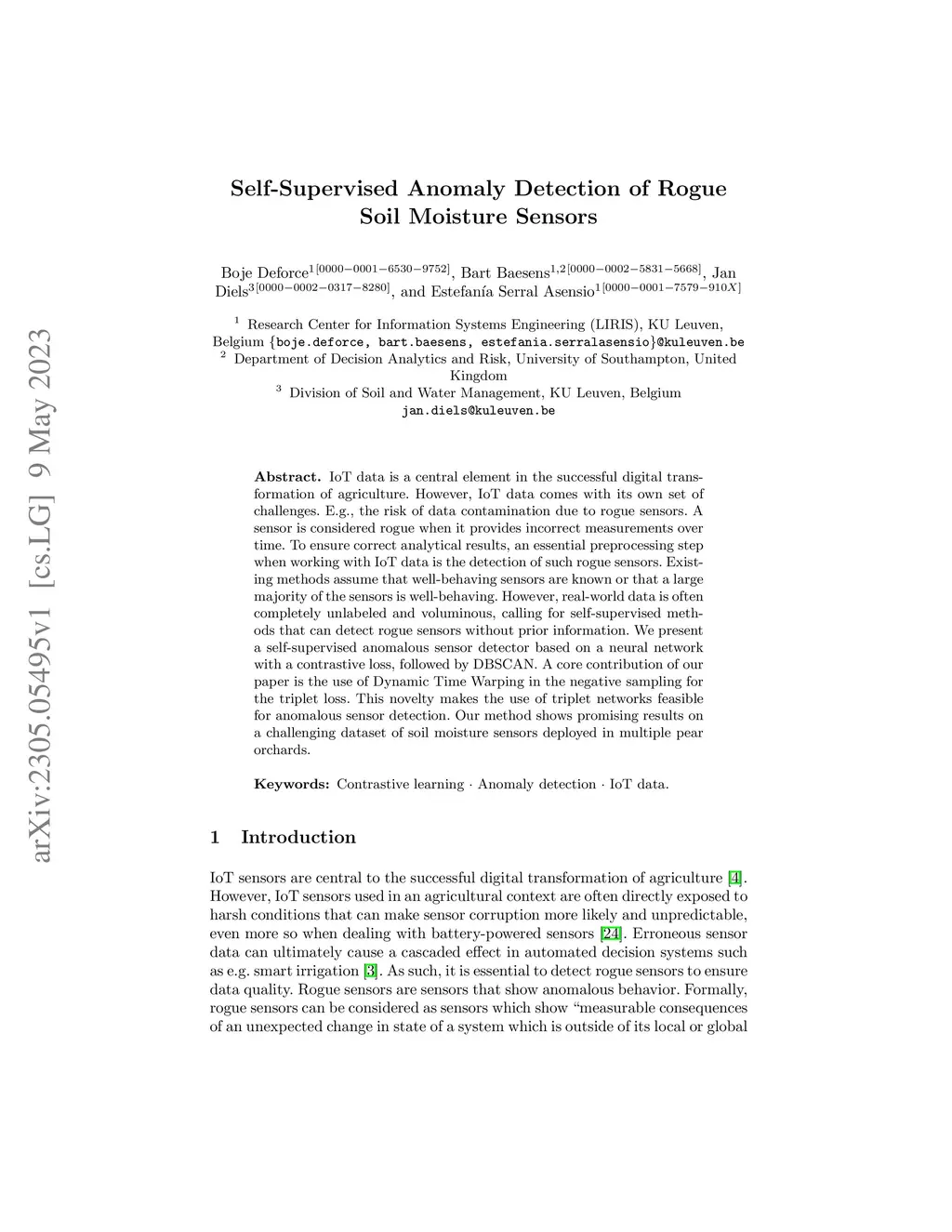 IoT data is a central element in the successful digital transformation of agriculture. However, IoT data comes with its own set of challenges. E.g., the risk of data contamination due to rogue sensors. A sensor is considered rogue when it provides incorrect measurements over time. To ensure correct analytical results, an essential preprocessing step when working with IoT data is the detection of such rogue sensors. Existing methods assume that well-behaving sensors are known or that a large majority of the sensors is well-behaving. However, real-world data is often completely unlabeled and voluminous, calling for self-supervised methods that can detect rogue sensors without prior information. We present a self-supervised anomalous sensor detector based on a neural network with a contrastive loss, followed by DBSCAN. A core contribution of our paper is the use of Dynamic Time Warping in the negative sampling for the triplet loss. This novelty makes the use of triplet networks feasible for anomalous sensor detection. Our method shows promising results on a challenging dataset of soil moisture sensors deployed in multiple pear orchards.