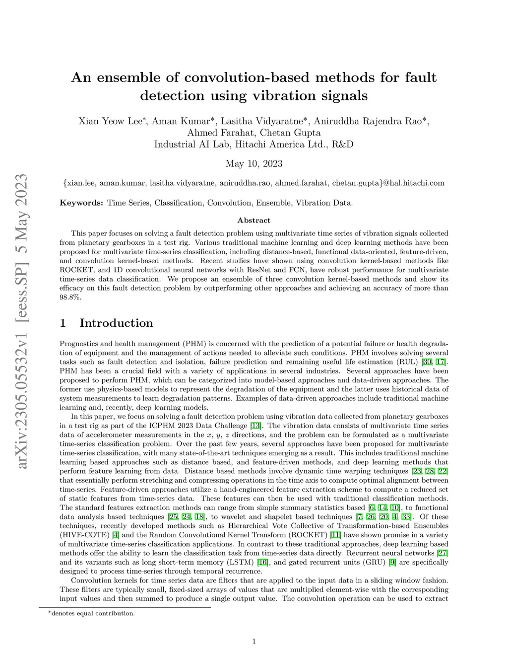This paper focuses on solving a fault detection problem using multivariate time series of vibration signals collected from planetary gearboxes in a test rig. Various traditional machine learning and deep learning methods have been proposed for multivariate time-series classification, including distance-based, functional data-oriented, feature-driven, and convolution kernel-based methods. Recent studies have shown using convolution kernel-based methods like ROCKET, and 1D convolutional neural networks with ResNet and FCN, have robust performance for multivariate time-series data classification. We propose an ensemble of three convolution kernel-based methods and show its efficacy on this fault detection problem by outperforming other approaches and achieving an accuracy of more than 98.8\%.