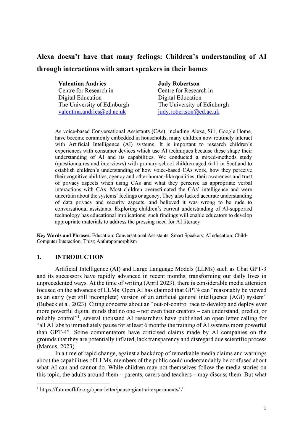 As voice-based Conversational Assistants (CAs), including Alexa, Siri, Google Home, have become commonly embedded in households, many children now routinely interact with Artificial Intelligence (AI) systems. It is important to research children's experiences with consumer devices which use AI techniques because these shape their understanding of AI and its capabilities. We conducted a mixed-methods study (questionnaires and interviews) with primary-school children aged 6-11 in Scotland to establish children's understanding of how voice-based CAs work, how they perceive their cognitive abilities, agency and other human-like qualities, their awareness and trust of privacy aspects when using CAs and what they perceive as appropriate verbal interactions with CAs. Most children overestimated the CAs' intelligence and were uncertain about the systems' feelings or agency. They also lacked accurate understanding of data privacy and security aspects, and believed it was wrong to be rude to conversational assistants. Exploring children's current understanding of AI-supported technology has educational implications; such findings will enable educators to develop appropriate materials to address the pressing need for AI literacy.