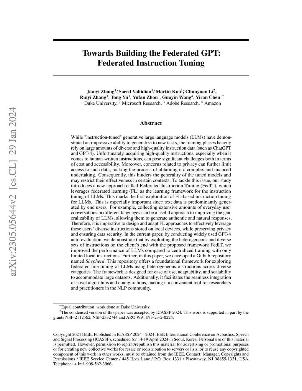 While "instruction-tuned" generative large language models (LLMs) have demonstrated an impressive ability to generalize to new tasks, the training phases heavily rely on large amounts of diverse and high-quality instruction data (such as ChatGPT and GPT-4). Unfortunately, acquiring high-quality data, especially when it comes to human-written data, can pose significant challenges both in terms of cost and accessibility. Moreover, concerns related to privacy can further limit access to such data, making the process of obtaining it a complex and nuanced undertaking. Consequently, this hinders the generality of the tuned models and may restrict their effectiveness in certain contexts. To tackle this issue, our study introduces a new approach called Federated Instruction Tuning (FedIT), which leverages federated learning (FL) as the learning framework for the instruction tuning of LLMs. This marks the first exploration of FL-based instruction tuning for LLMs. This is especially important since text data is predominantly generated by end users. Therefore, it is imperative to design and adapt FL approaches to effectively leverage these users' diverse instructions stored on local devices, while preserving privacy and ensuring data security. In the current paper, by conducting widely used GPT-4 auto-evaluation, we demonstrate that by exploiting the heterogeneous and diverse sets of instructions on the client's end with the proposed framework FedIT, we improved the performance of LLMs compared to centralized training with only limited local instructions. Further, in this paper, we developed a Github repository named Shepherd. This repository offers a foundational framework for exploring federated fine-tuning of LLMs using heterogeneous instructions across diverse categories.