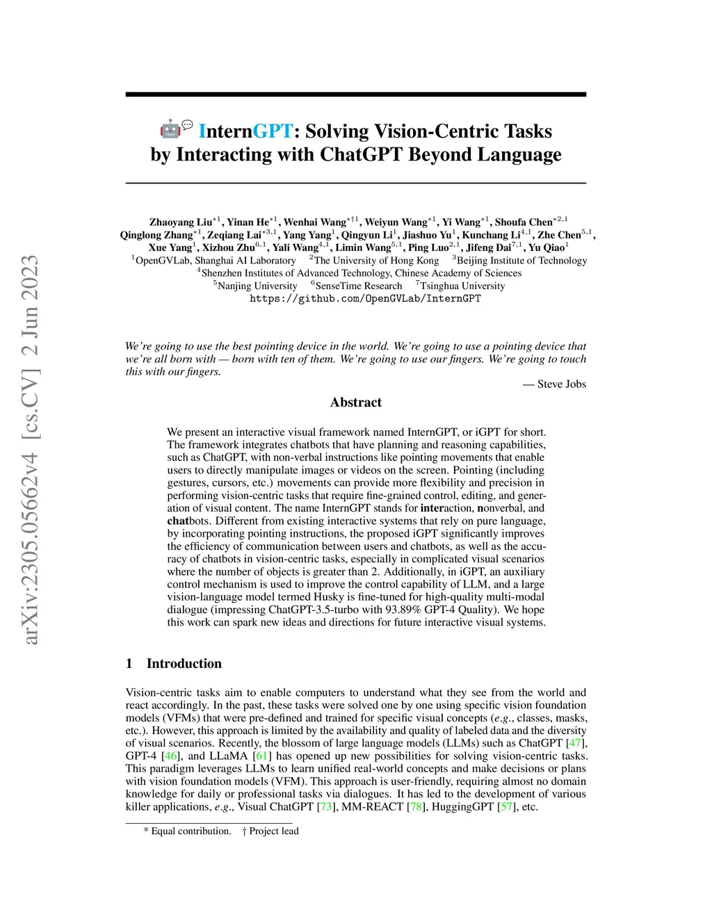 We present an interactive visual framework named InternGPT, or iGPT for short. The framework integrates chatbots that have planning and reasoning capabilities, such as ChatGPT, with non-verbal instructions like pointing movements that enable users to directly manipulate images or videos on the screen. Pointing (including gestures, cursors, etc.) movements can provide more flexibility and precision in performing vision-centric tasks that require fine-grained control, editing, and generation of visual content. The name InternGPT stands for \textbf{inter}action, \textbf{n}onverbal, and \textbf{chat}bots. Different from existing interactive systems that rely on pure language, by incorporating pointing instructions, the proposed iGPT significantly improves the efficiency of communication between users and chatbots, as well as the accuracy of chatbots in vision-centric tasks, especially in complicated visual scenarios where the number of objects is greater than 2. Additionally, in iGPT, an auxiliary control mechanism is used to improve the control capability of LLM, and a large vision-language model termed Husky is fine-tuned for high-quality multi-modal dialogue (impressing ChatGPT-3.5-turbo with 93.89\% GPT-4 Quality). We hope this work can spark new ideas and directions for future interactive visual systems. Welcome to watch the code at https://github.com/OpenGVLab/InternGPT.