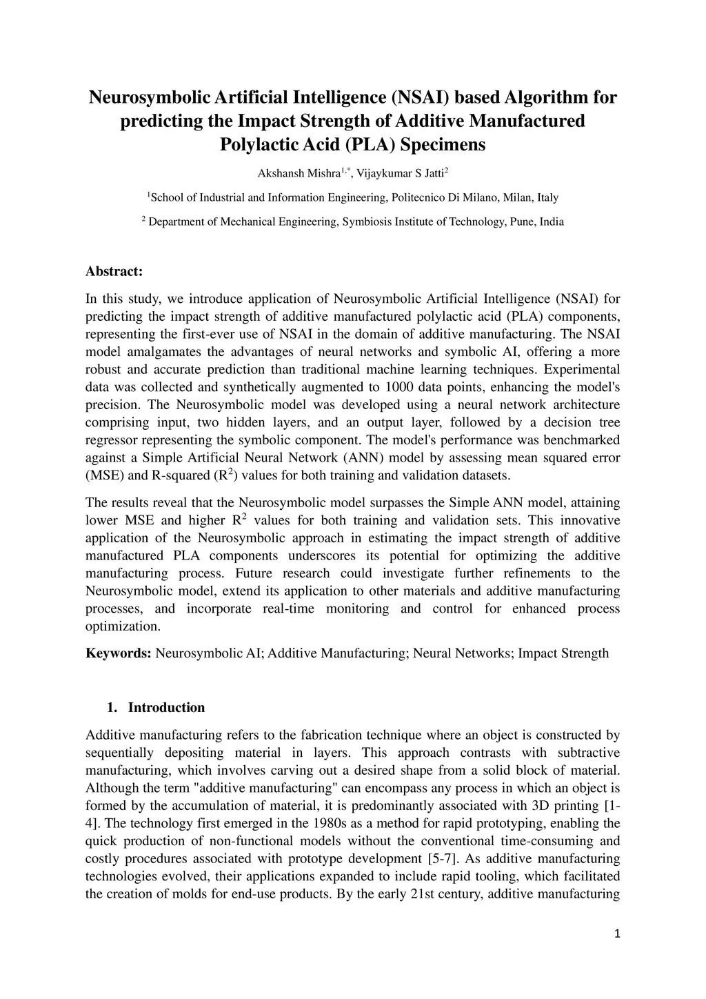 In this study, we introduce application of Neurosymbolic Artificial Intelligence (NSAI) for predicting the impact strength of additive manufactured polylactic acid (PLA) components, representing the first-ever use of NSAI in the domain of additive manufacturing. The NSAI model amalgamates the advantages of neural networks and symbolic AI, offering a more robust and accurate prediction than traditional machine learning techniques. Experimental data was collected and synthetically augmented to 1000 data points, enhancing the model's precision. The Neurosymbolic model was developed using a neural network architecture comprising input, two hidden layers, and an output layer, followed by a decision tree regressor representing the symbolic component. The model's performance was benchmarked against a Simple Artificial Neural Network (ANN) model by assessing mean squared error (MSE) and R-squared (R2) values for both training and validation datasets. The results reveal that the Neurosymbolic model surpasses the Simple ANN model, attaining lower MSE and higher R2 values for both training and validation sets. This innovative application of the Neurosymbolic approach in estimating the impact strength of additive manufactured PLA components underscores its potential for optimizing the additive manufacturing process. Future research could investigate further refinements to the Neurosymbolic model, extend its application to other materials and additive manufacturing processes, and incorporate real-time monitoring and control for enhanced process optimization.