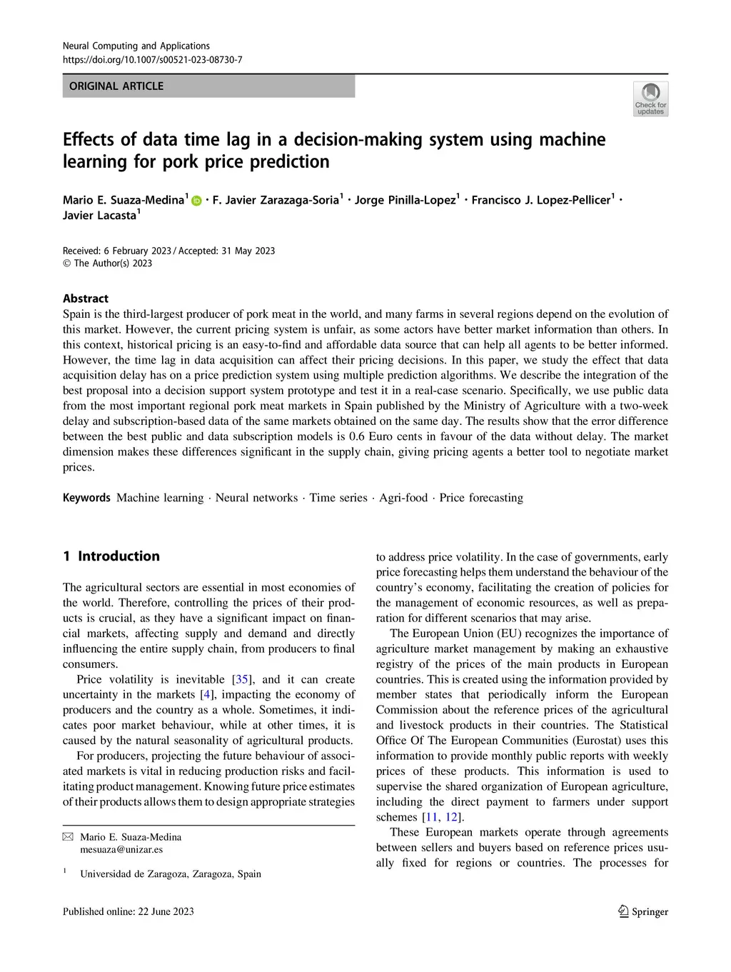 Spain is the third-largest producer of pork meat in the world, and many farms in several regions depend on the evolution of this market. However, the current pricing system is unfair, as some actors have better market information than others. In this context, historical pricing is an easy-to-find and affordable data source that can help all agents to be better informed. However, the time lag in data acquisition can affect their pricing decisions. In this paper, we study the effect that data acquisition delay has on a price prediction system using multiple prediction algorithms. We describe the integration of the best proposal into a decision support system prototype and test it in a real-case scenario. Specifically, we use public data from the most important regional pork meat markets in Spain published by the Ministry of Agriculture with a two-week delay and subscription-based data of the same markets obtained on the same day. The results show that the error difference between the best public and data subscription models is 0.6 Euro cents in favor of the data without delay. The market dimension makes these differences significant in the supply chain, giving pricing agents a better tool to negotiate market prices.